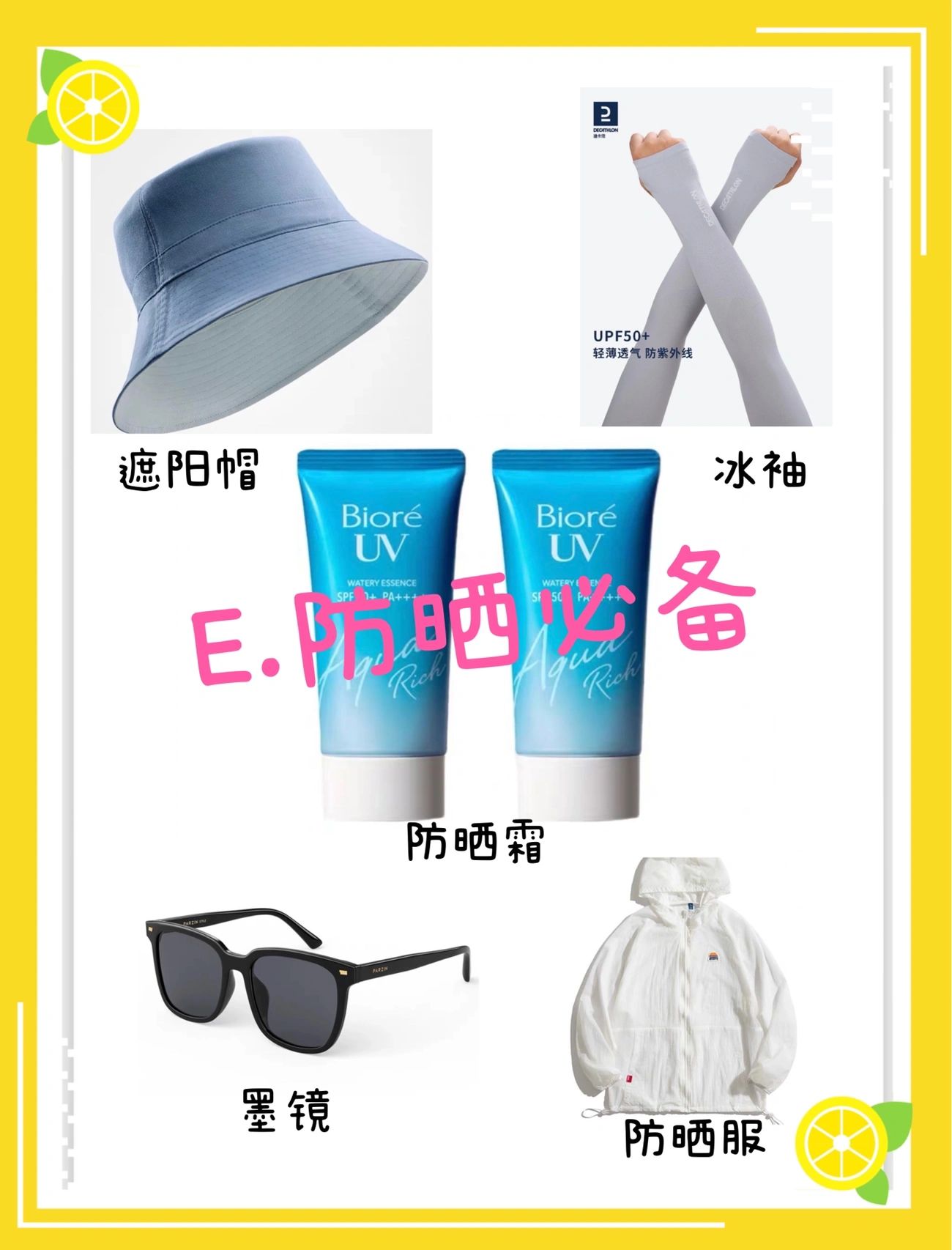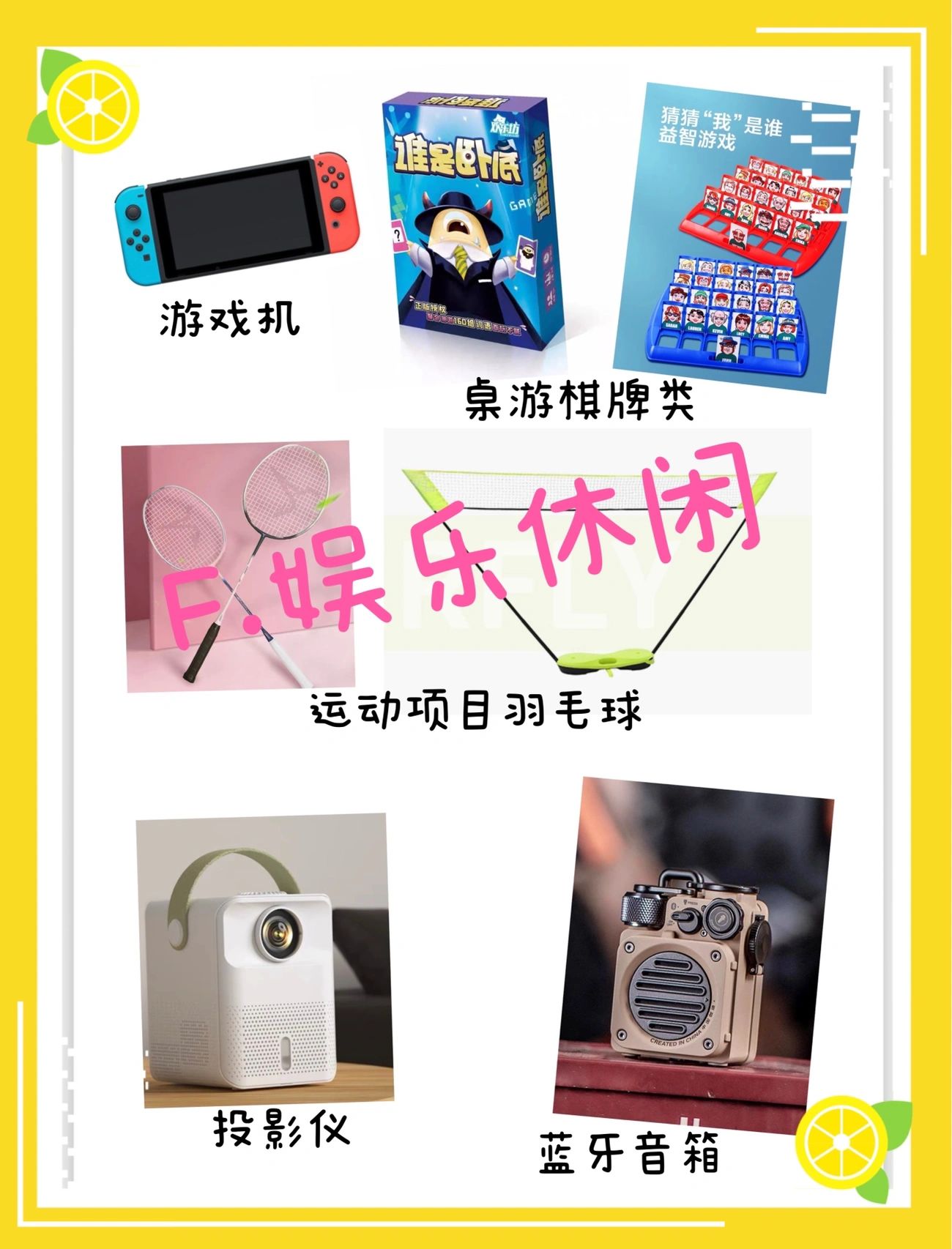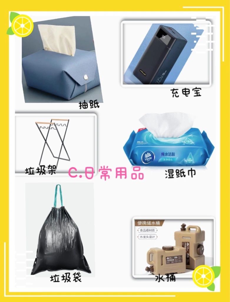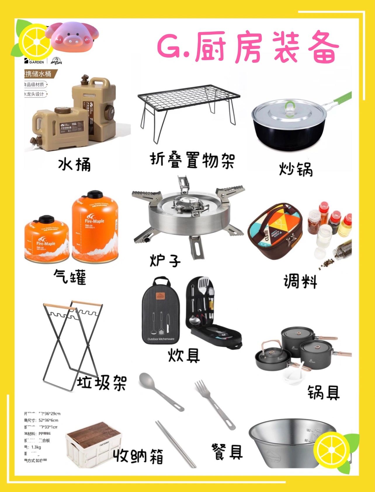 (其他选配)香薰蜡烛,耳塞,眼罩,氛围彩灯日用品:餐巾纸,湿纸巾,垃圾袋及架子,水桶,充电宝。可根据自己游玩时间或者用电装备考虑是否需要大的移动电源。常备护理:酒精喷雾,碘伏棉签,创可贴,驱蚊液,止痒膏,达喜,开瑞坦。防晒必备:遮阳帽,冰袖,墨镜,防晒服,防晒霜娱乐休闲:游戏机,卡牌桌游,户外羽毛球网及球拍,蓝牙音箱,投影仪。厨房系统:卡式炉,气罐,调料包,炒锅,套锅,炊具,餐具,置物架,水桶,垃圾架,收纳箱。