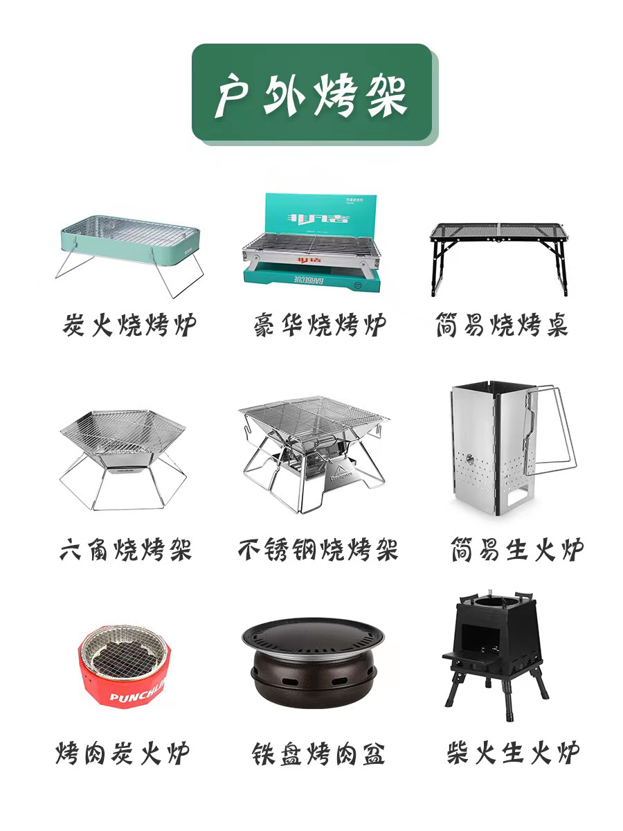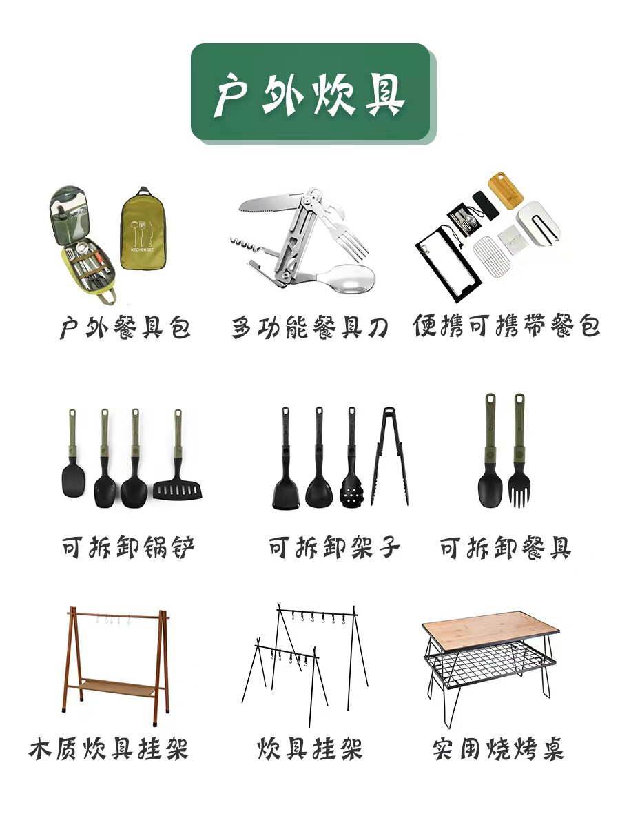 【户外炊具】户外厨房简直是露营的乐趣所在,烤盘、烧烤、生火炉、叉勺、餐碗一个少不了,可以BBQ、烤肉、煎牛排等等让你有种满足感。