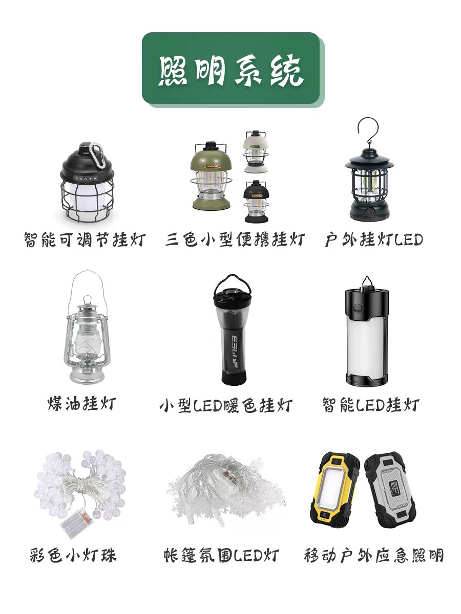 【照明】一般露营地灯有气罐、煤油灯、LED三种,新手露营选择LED会方便很多,危险系数也会大幅度减低,一套完整的照明配置系统还可以选择帐篷灯、主灯、挂灯、氛围灯、桌灯等,可以根据自己营地的大小配置。