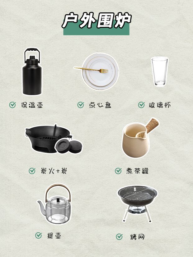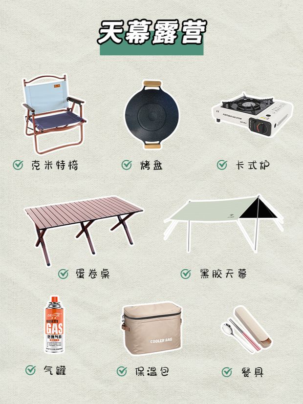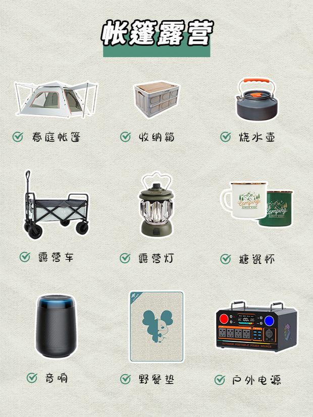 马上晴朗的日子不想宅在家就去户外度过一个惬意下午吧!好多人会关心,都要带些什么装备呢? 下面来分享一下经验 公园露营: 帐篷、天幕、露营灯、露营车、收纳箱、克米特椅、蛋卷桌、烤盘、卡式炉、烧水壶、灯串、折叠水桶、保温包、杯子 帐篷露营: 露营灯、帐篷、收纳箱、杯子、音响、烧水壶、露营车、户外电源、野餐垫 天幕露营: 天幕、烤盘、卡式炉、蛋卷桌、餐具、气罐、克米特椅、保温包 户外围炉: 炭炉+碳、保温壶、煮茶罐、烤网、提壶、点心盘、玻璃杯
