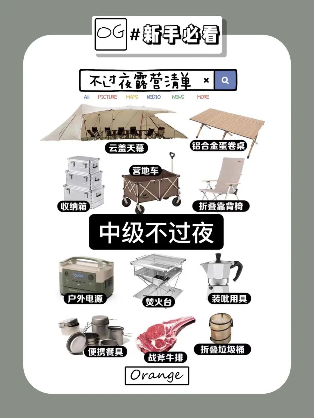 新手露营装备清单! 1.初级不过夜: 天幕,营地车 ,蛋卷桌 ,收纳箱 ,折叠椅,帐篷 ,充电宝,卡式炉,防潮地垫 ,一次性餐具,垃圾袋 (根据自己的需求过不过夜、东西多不多去添置) 2.中级不过夜: 天幕,营地车, 蛋卷桌, 收纳箱 , 折叠椅 ,户外电源,樊火台,便携餐具,折叠垃圾桶