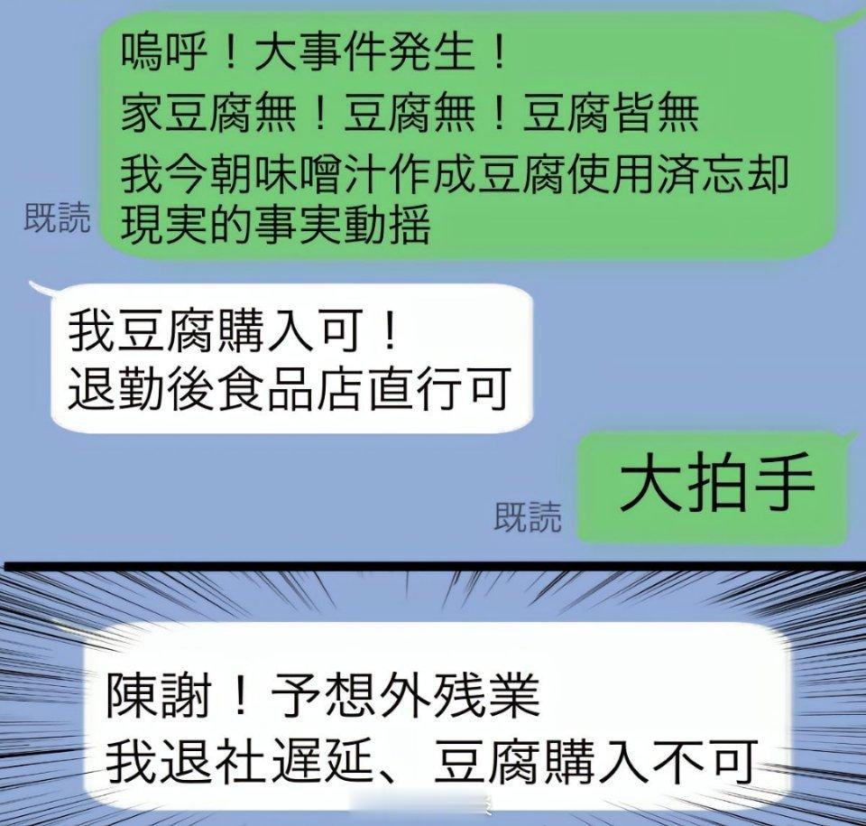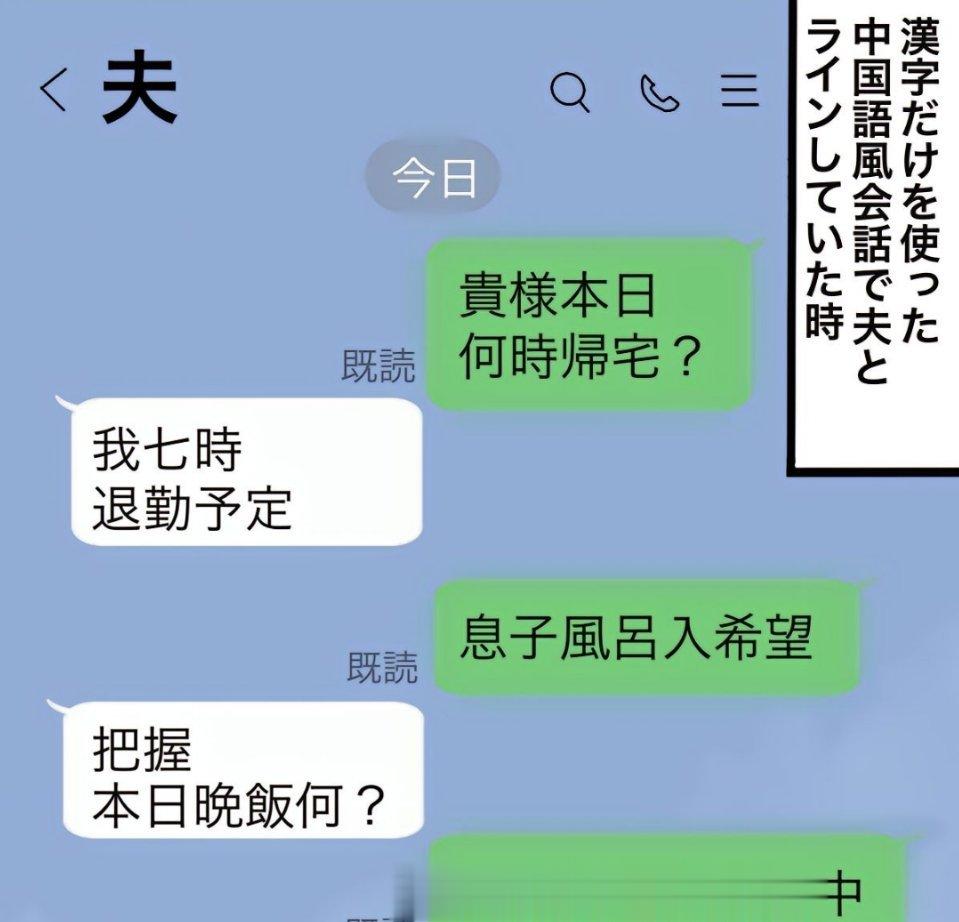 日本妹子在推特分享和老公的伪中文对话聊天记录,去掉了假名,日语有种文言文的感觉。