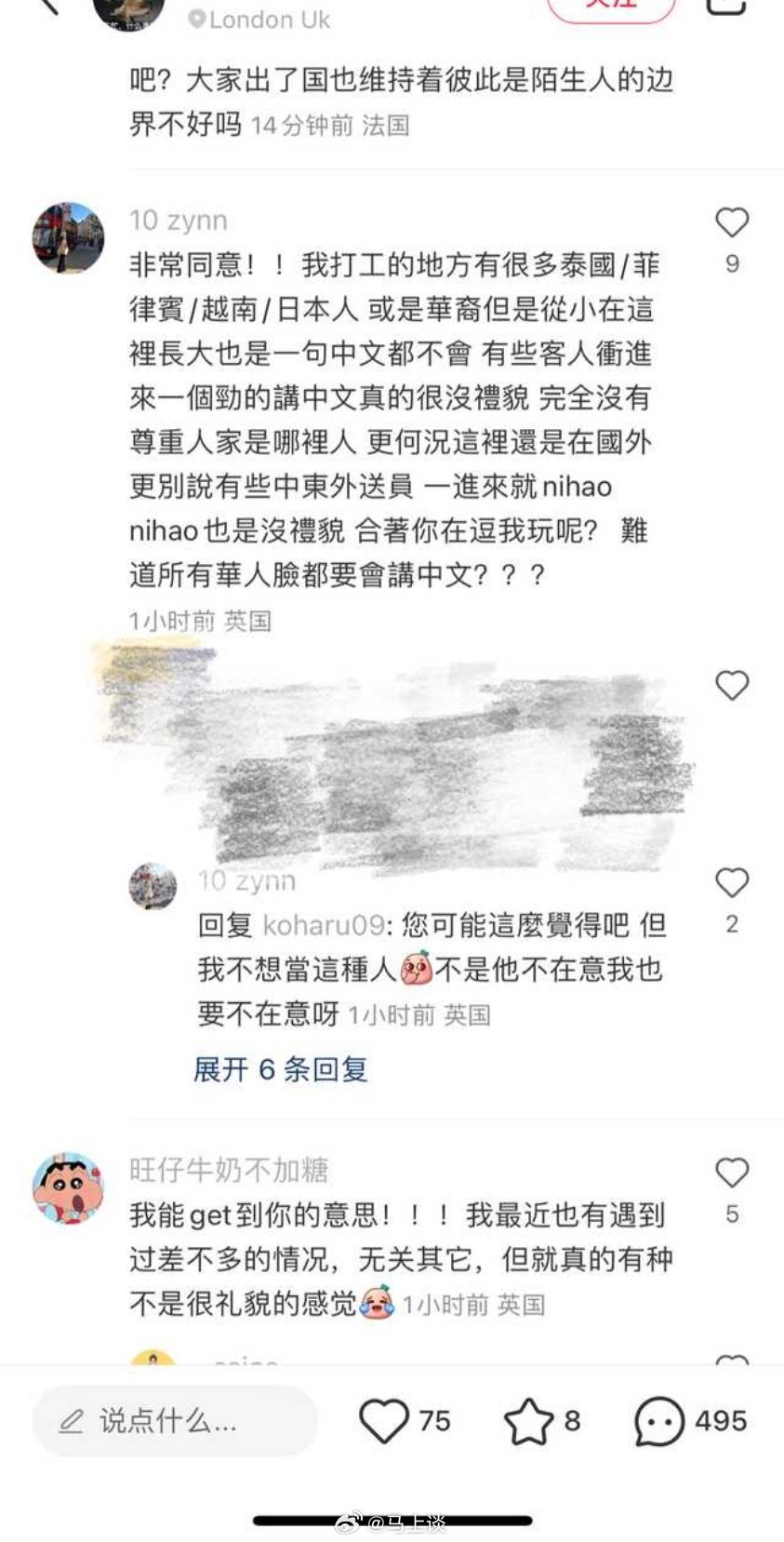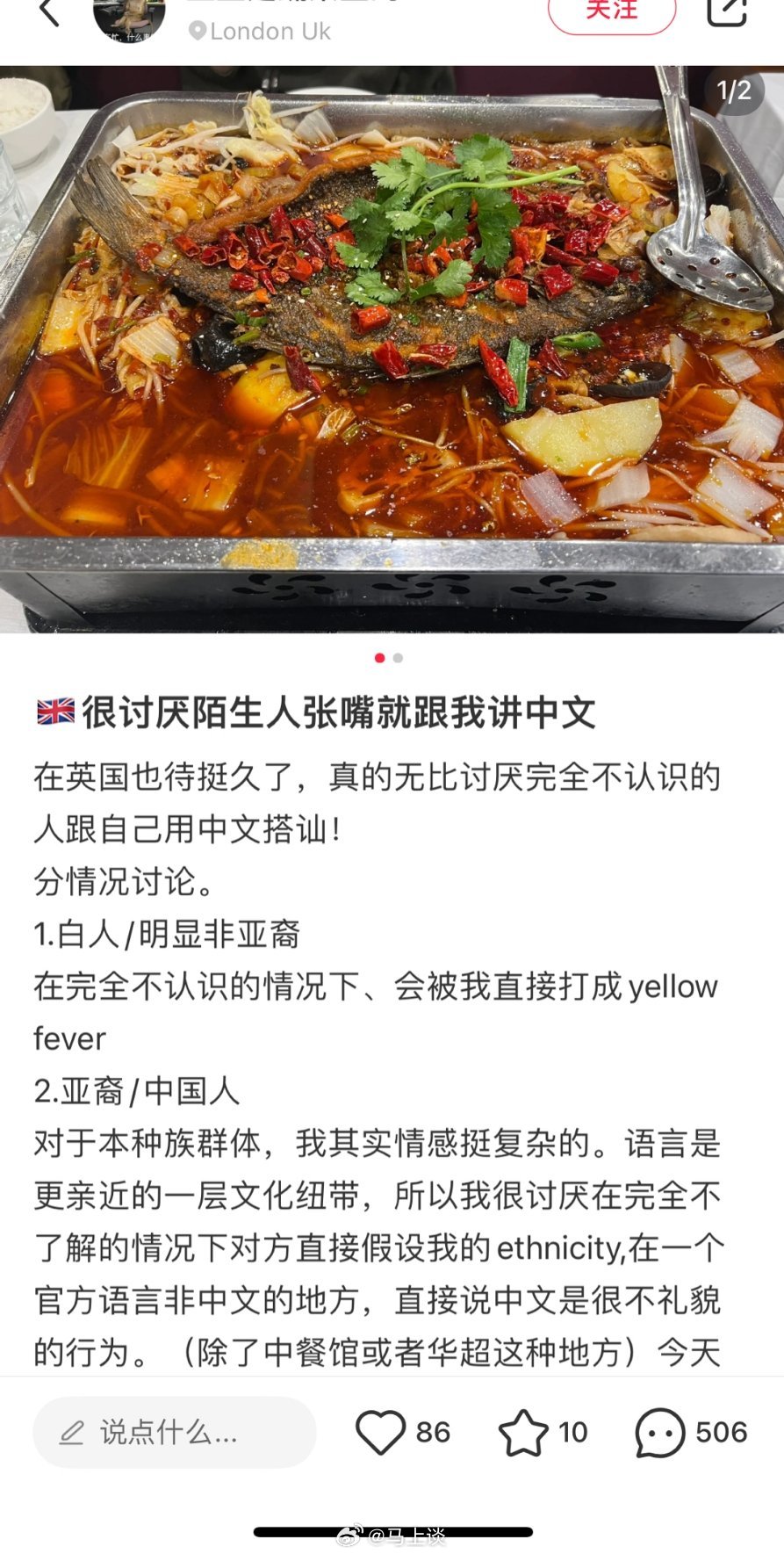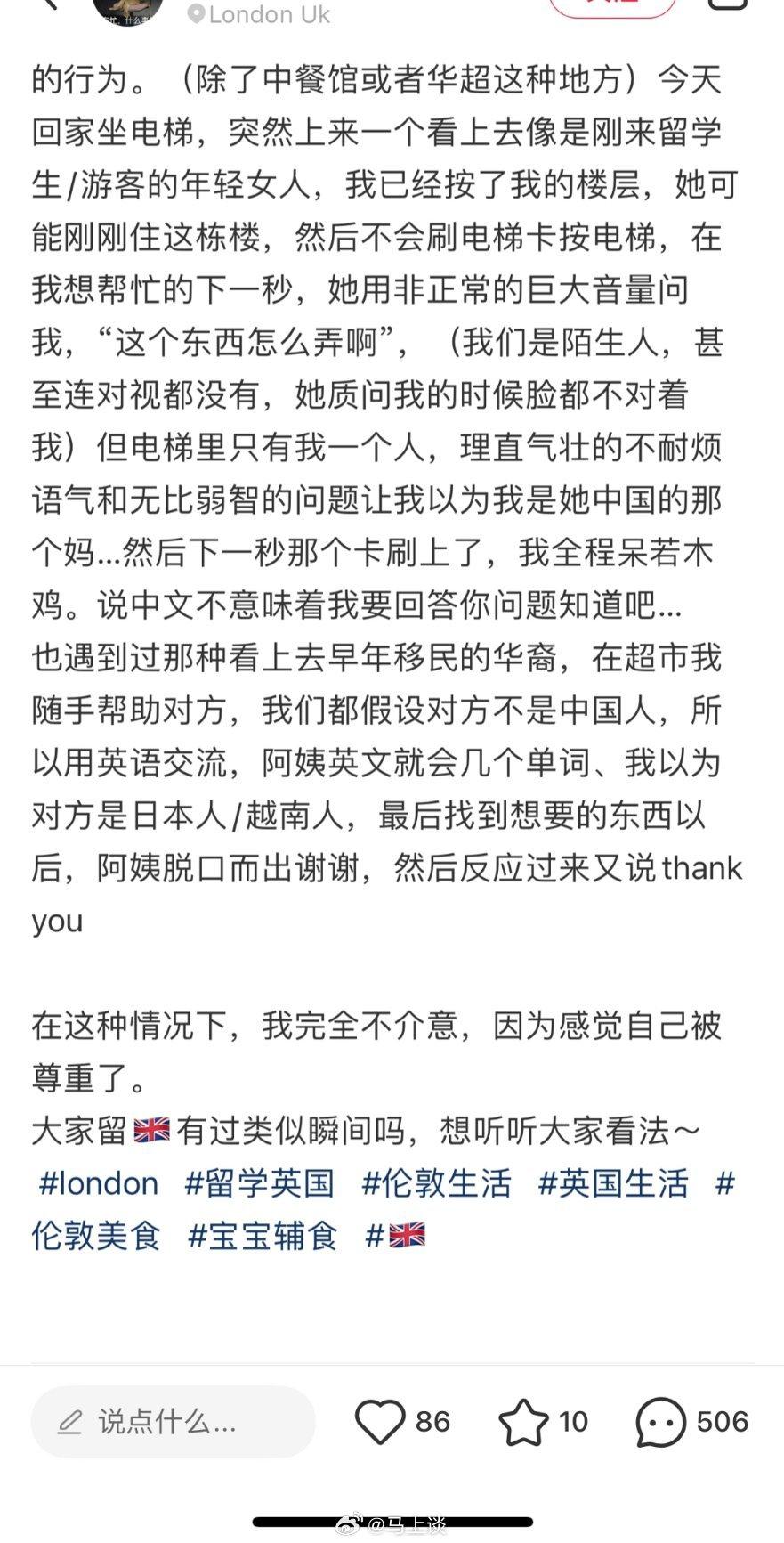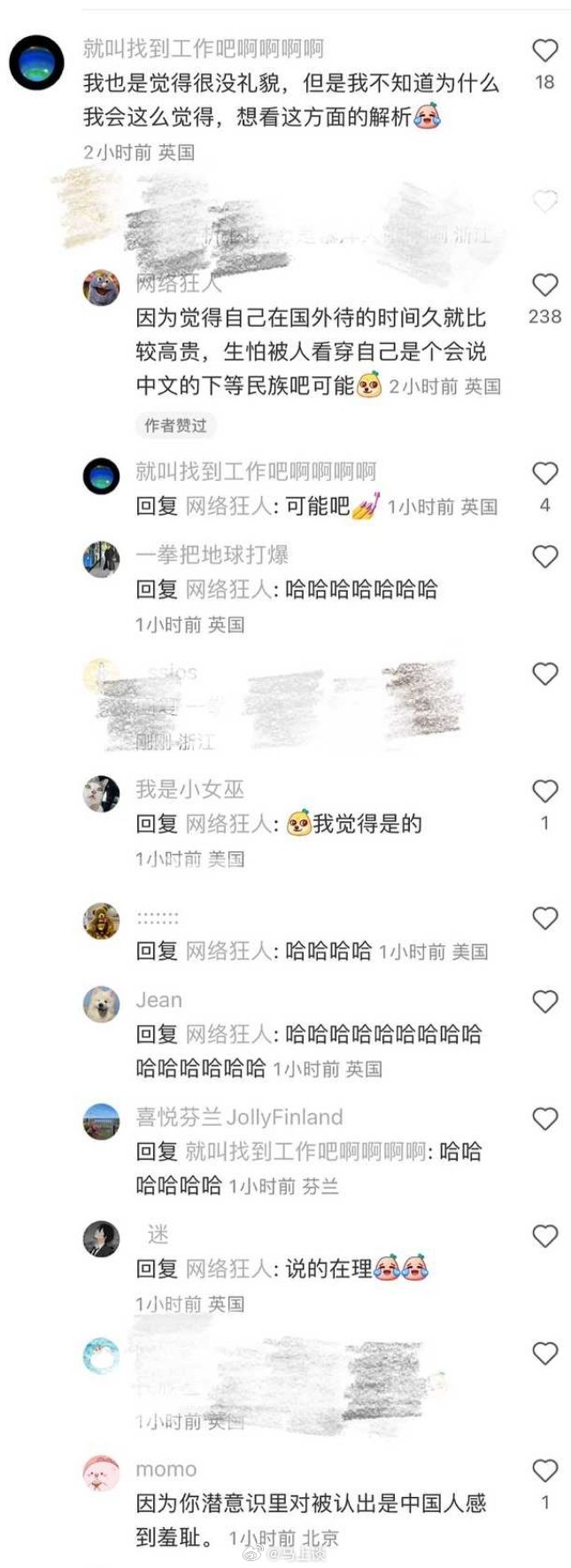 网友投稿:“一中国人在英国被人直接说中文,感到被冒犯和厌恶”…网友总结的很对,这位殖人是潜意识里觉得被当做中国人感到羞耻,恨不得把自己这身皮扒了!还嘀嘀咕咕找了那么多理由,用中文发在中文平台上,羞辱中国人!赶紧去做整容,整的西化一点就不会这样了。