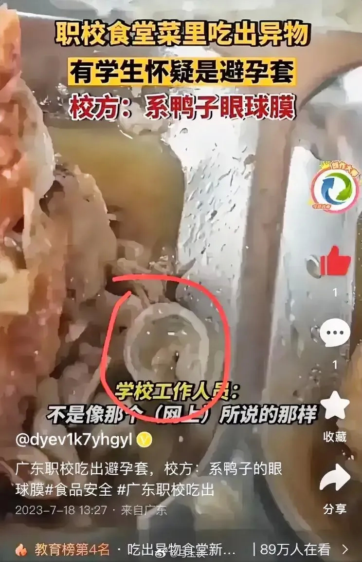 #食堂异物高度可能为鸭眼球巩膜# 出结果了:排除橡胶制品和一次性手套可能,检出鸭源性和蛋白质成分,红外光谱显示为鸭巩膜,高度可能为鸭眼球巩膜结构。对此,#爆料食堂吃出异物学生再发声# :“我们学生也是不希望事情闹大,继续发酵,对我们日常生活造成影响。”