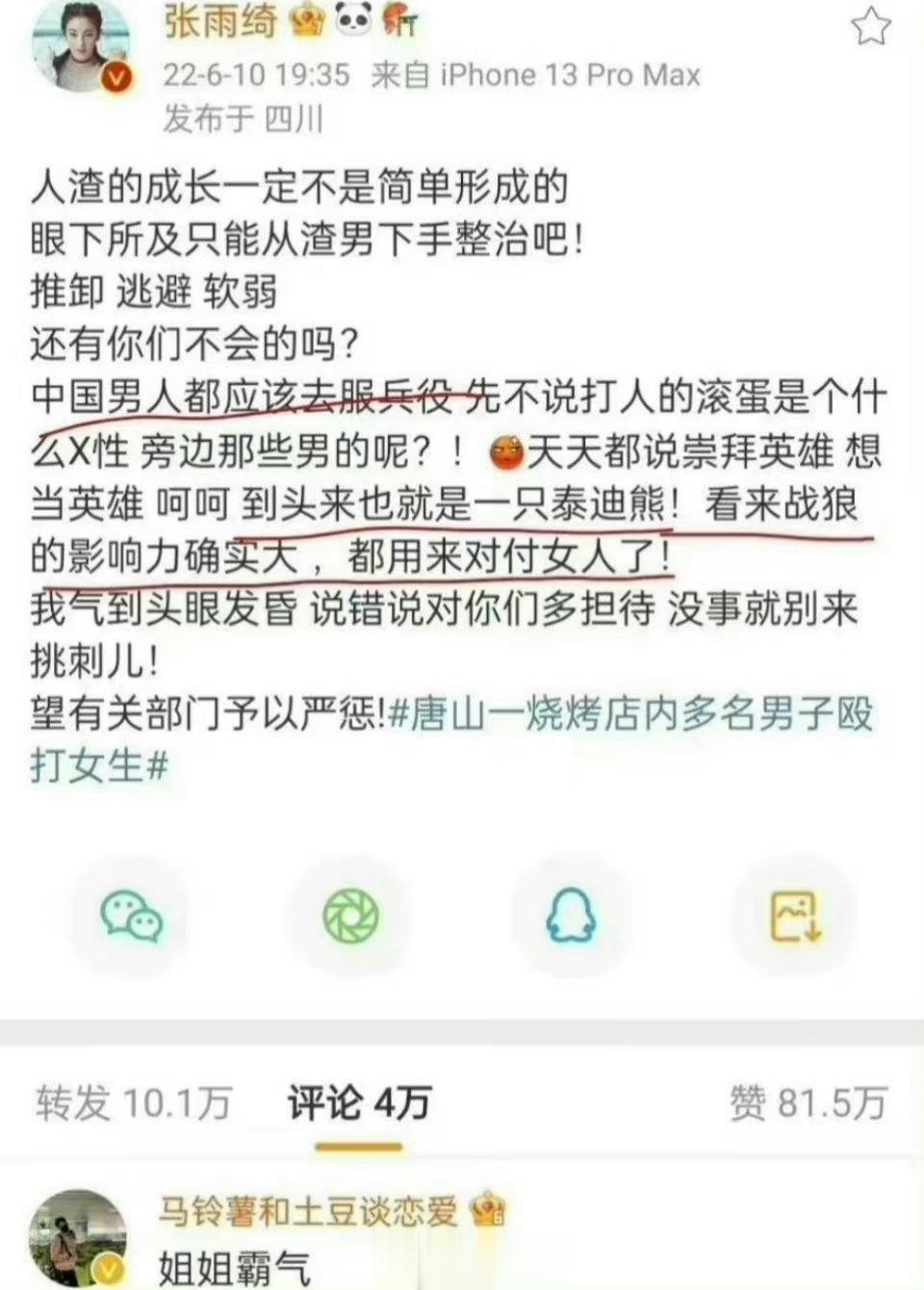 #张雨绮初中因为颜值被全校围观#看来戛纳电影节那帮摄影师真的瞎了眼,居然不拍颜王张雨绮!需要男人时,怒骂泰迪熊、呼唤战狼,不需要时手机套“会呼吸的男人很减分”,带货时699一双袜子,打造独立女性时嘲笑别人结婚…中国为什么男女间对立管不好?因为太放纵像张雨绮这样吃性别流量的明星了,节目组、电视台了为了有毒的收视率和流量拼命请她,还怎么管的好?