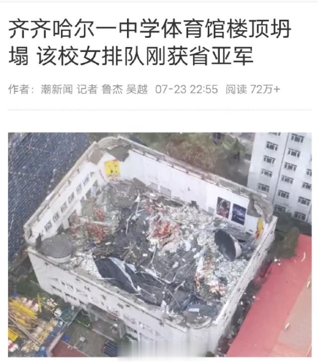 7月23日15时许,齐齐哈尔第三十四中学体育馆发生坍塌,经过全力抢救,仍致10人死亡…据悉,馆内人员是训练排球的老师和队员,该中学刚刚获得全省女排亚军。