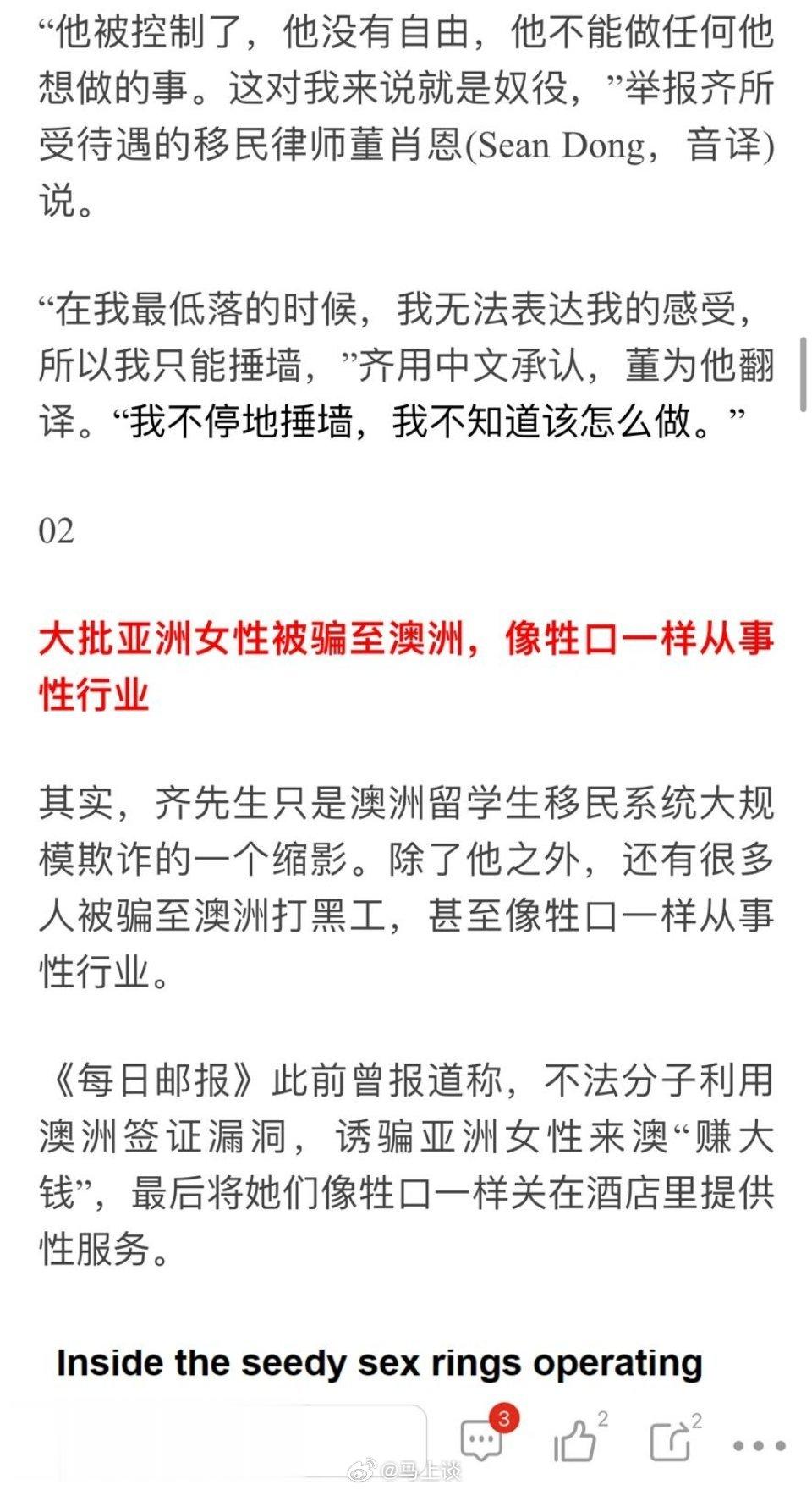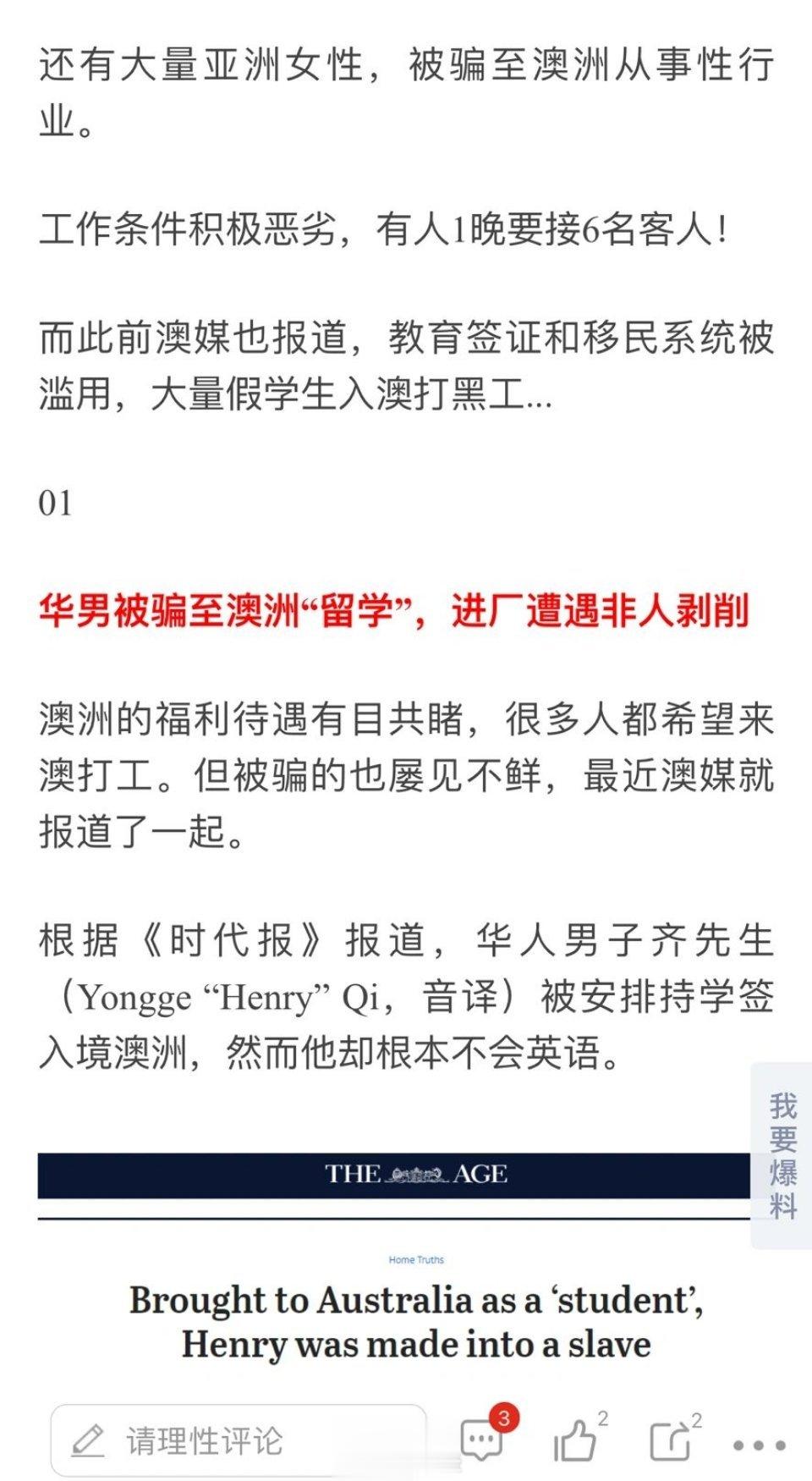 澳媒报道华人男子被骗来澳洲留学,护照被没收,进厂打工超长时间上班、吃剩饭。华人女子被压榨变性奴…