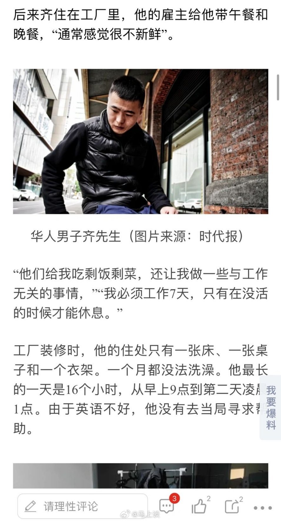 澳媒报道华人男子被骗来澳洲留学,护照被没收,进厂打工超长时间上班、吃剩饭。华人女