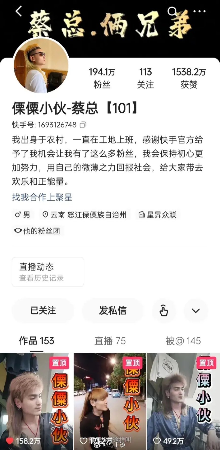 #怒江百万网红蔡金发账号涉黄被封# 蔡金发在社交帐号上发布了一段24秒的隐私视频,其内容为“全裸出镜唱歌给女子看”…被陷害?还是成名太快有点飘?
