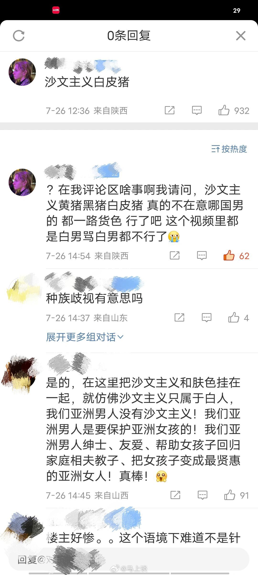 街坊爱尔兰白人男性对女权运动的看法,视频中很多人都承认自己是一名沙文主义者,发表了各种歧视女性的言论!然后一网友在视频下骂了句:沙文主义白皮猪,结果捅了马蜂窝……各位要清醒,有些人真的只要遇到白男,就啥啥权利都不要了…我们只能尊重祝福她们[允悲][允悲][允悲]