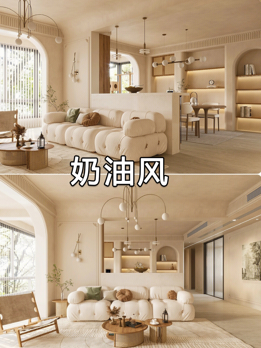 用奶咖、奶白等低饱和度色彩,让空间整体呈现被细腻奶油包裹的软糯质感。