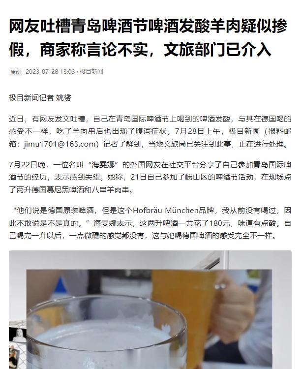 外国女子吐槽青岛啤酒节啤酒发酸羊肉疑似掺假,商家称其言论不实已发通告,要追究她的责任。[吃瓜]