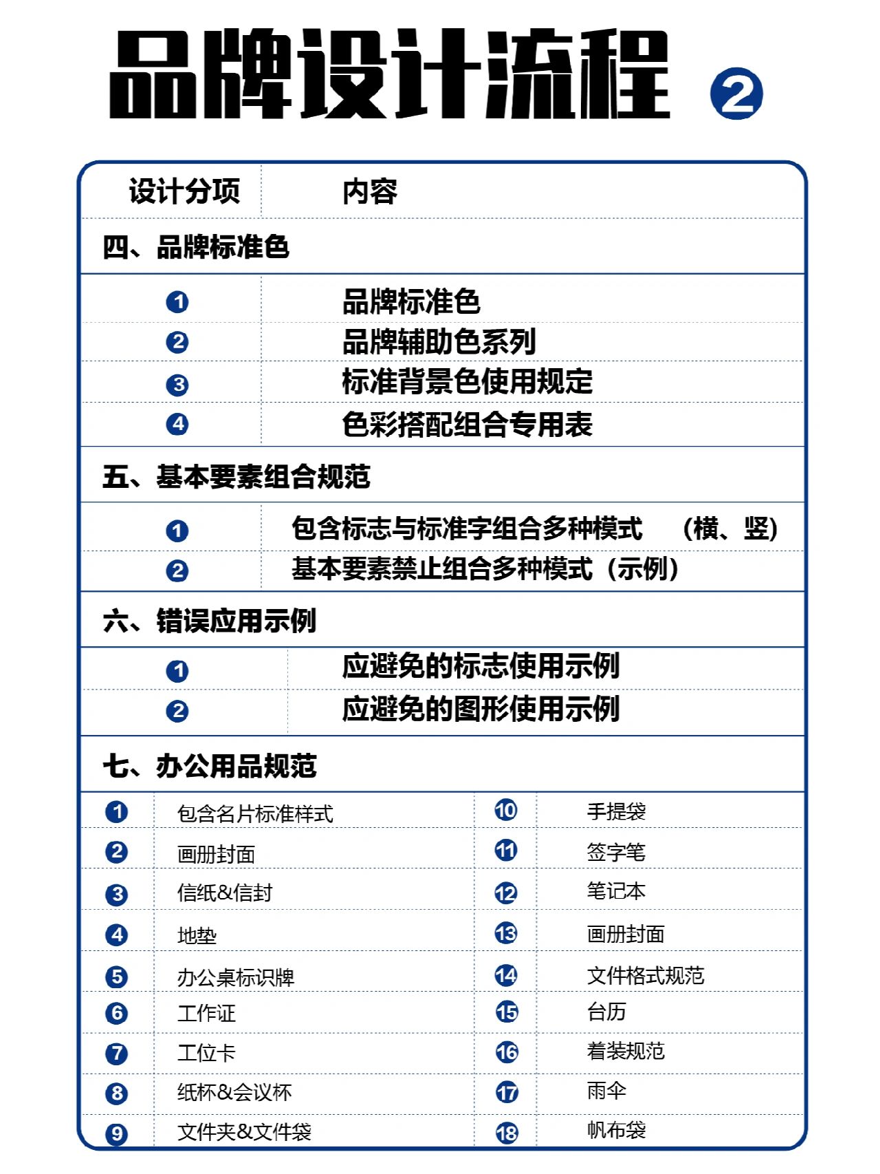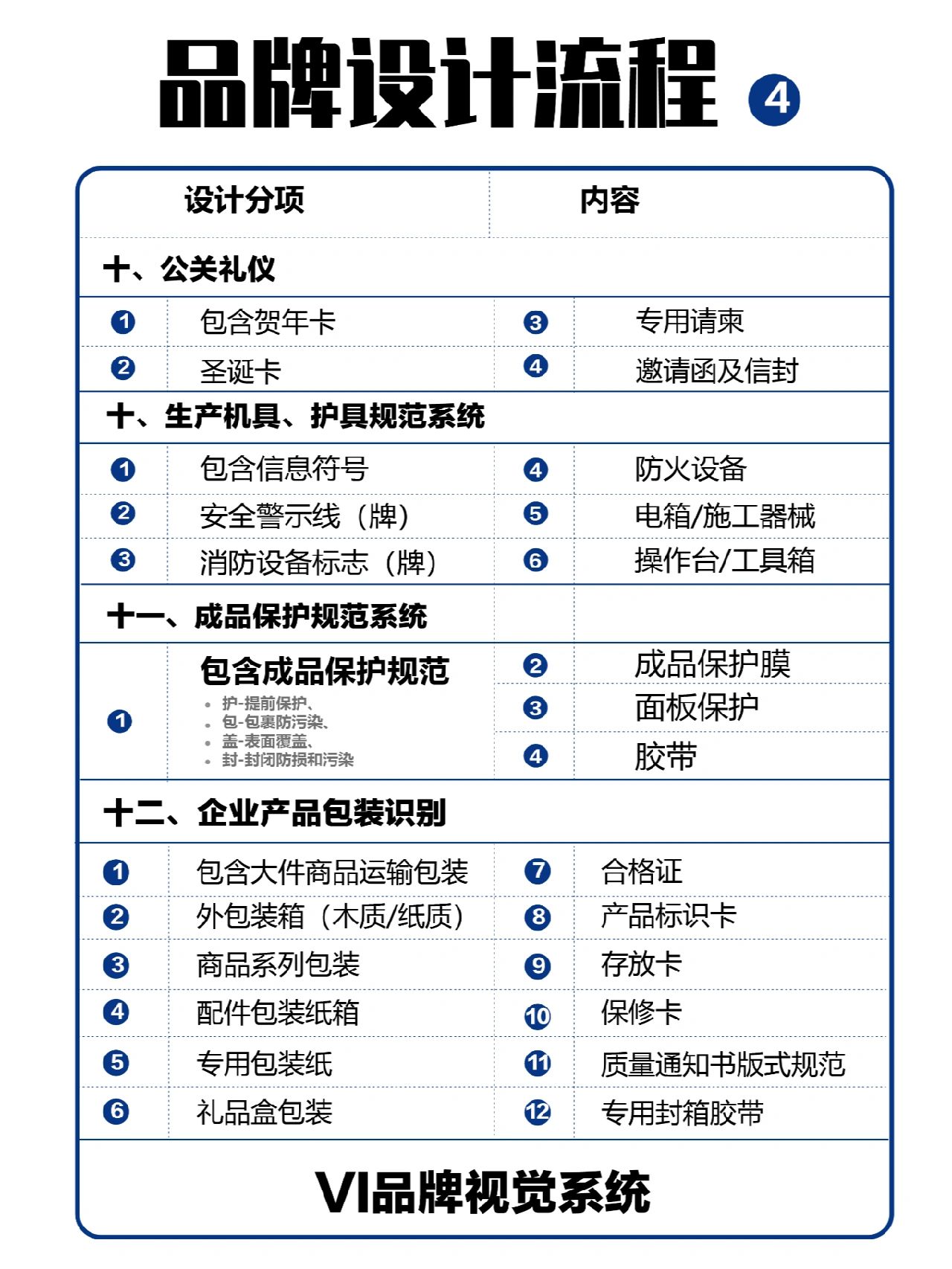 一套优秀的VI系统,提升企业专业形象,也会让用户很快的记住他, 一套品牌的设计要准备哪些内容呢? 品牌设计前要做足功课,了解设计内容,进度流程,有些过程还需要同时开展奥。 今天将设计流程列出 1.标志LOGO 2.企业标准字 3.企业标准色 4.基本要素组合规范 5.印刷字体 6.办公用品 7.公关礼仪 8.环境导视系统 9.现场形象规范 10.生产车间规范系统 11.成品保护规范系统 12.企业产品包装识别