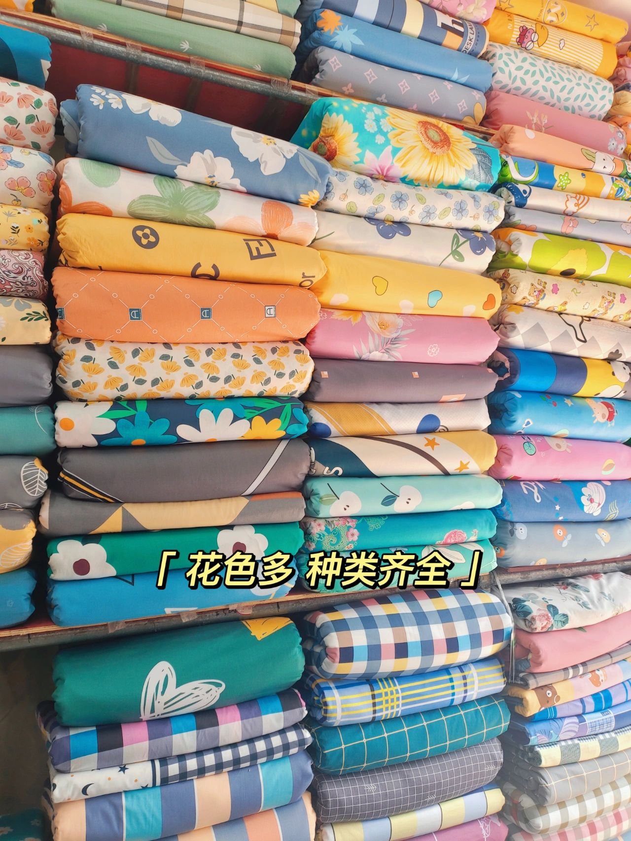 花色种类丰富,虽然没有专做零售的陈列好看,但是一眼望去啥子花色和款式都有。料子很多,水洗棉、磨绒棉·····等等,种类很是齐全。