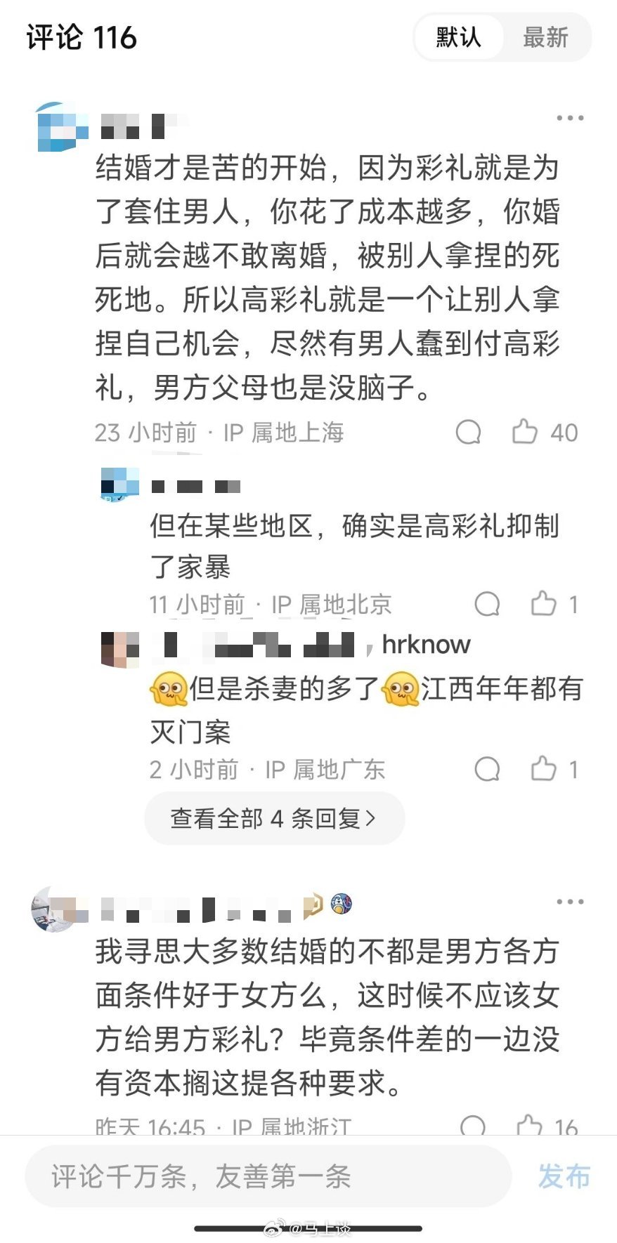 大深 回复 用户10xxx61 08-01 20:15 你听谁说的重刑反过来了?有点常识行吗!金字塔模式的比例,下层给减少了,塔尖能是正常的数?重刑犯你自己看看是什么类型的罪,比如都是拿刀砍人,都是砍胳膊,男的砍判重刑犯罪,女的砍轻伤判中度罪还少30%,这么犯罪人员性别比例还有意义吗?同样的行为都是两种结果,你自己想想女的能被判重刑犯罪得是什么样的!