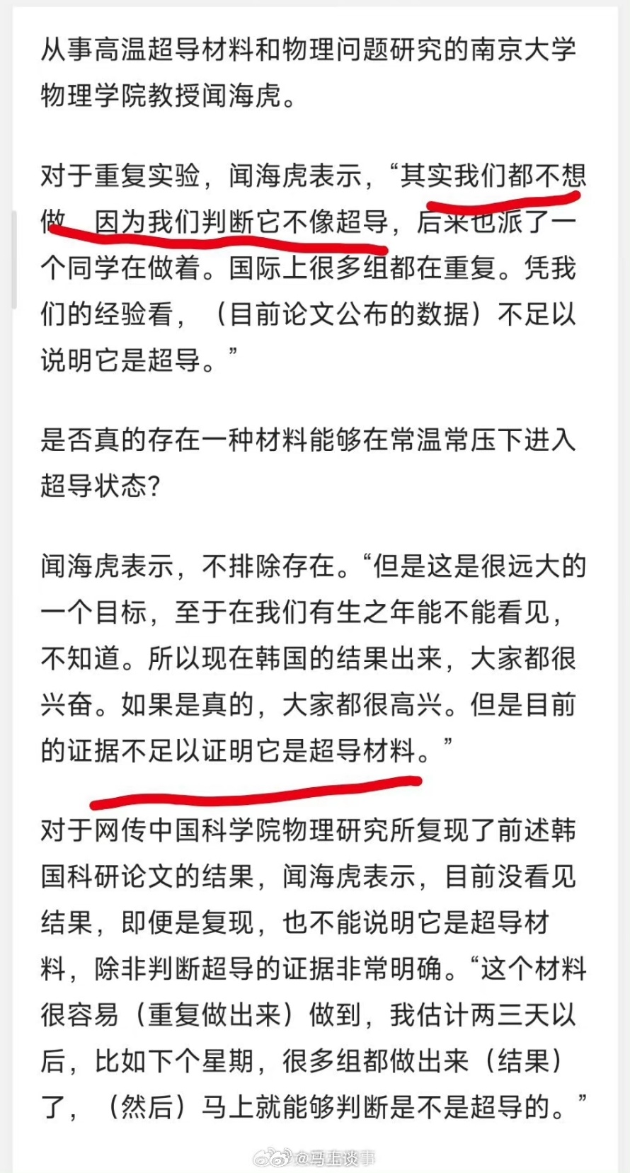 #专家称韩国超导是超导假象# 此前,韩国高丽大学教授权永万团队称成功合成常压室温超导体,在室温超导领域的重大突破,开启了一个全新的历史时代。南京大学闻海虎教授称,从三个方面——电阻、磁化和所谓的磁悬浮,都不足以说明它是超导现象(材料),我们判断(它所谓的超导)极有可能是个假象。对于重复实验,闻海虎表示,“其实我们都不想做,因为我们判断它不像超导,后来也派了一个同学在,凭我们的经验看,(目前论文公布的数据)不足以说明它是超导。”闻海虎仍表示,不排除存在(一丝可能),“但是这是很远大的一个目标,至于在我们有生之年能不能看见,不知道。所以现在韩国的结果出来,大家都很兴奋。如果是真的,大家都很高兴。但是目前的证据不足以证明它是超导材料。”