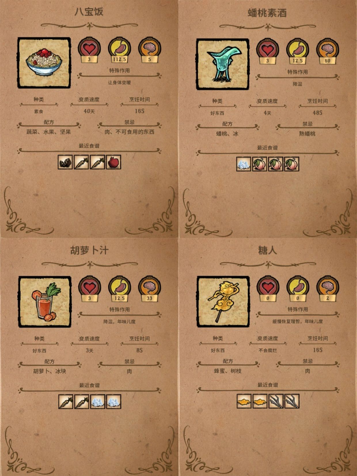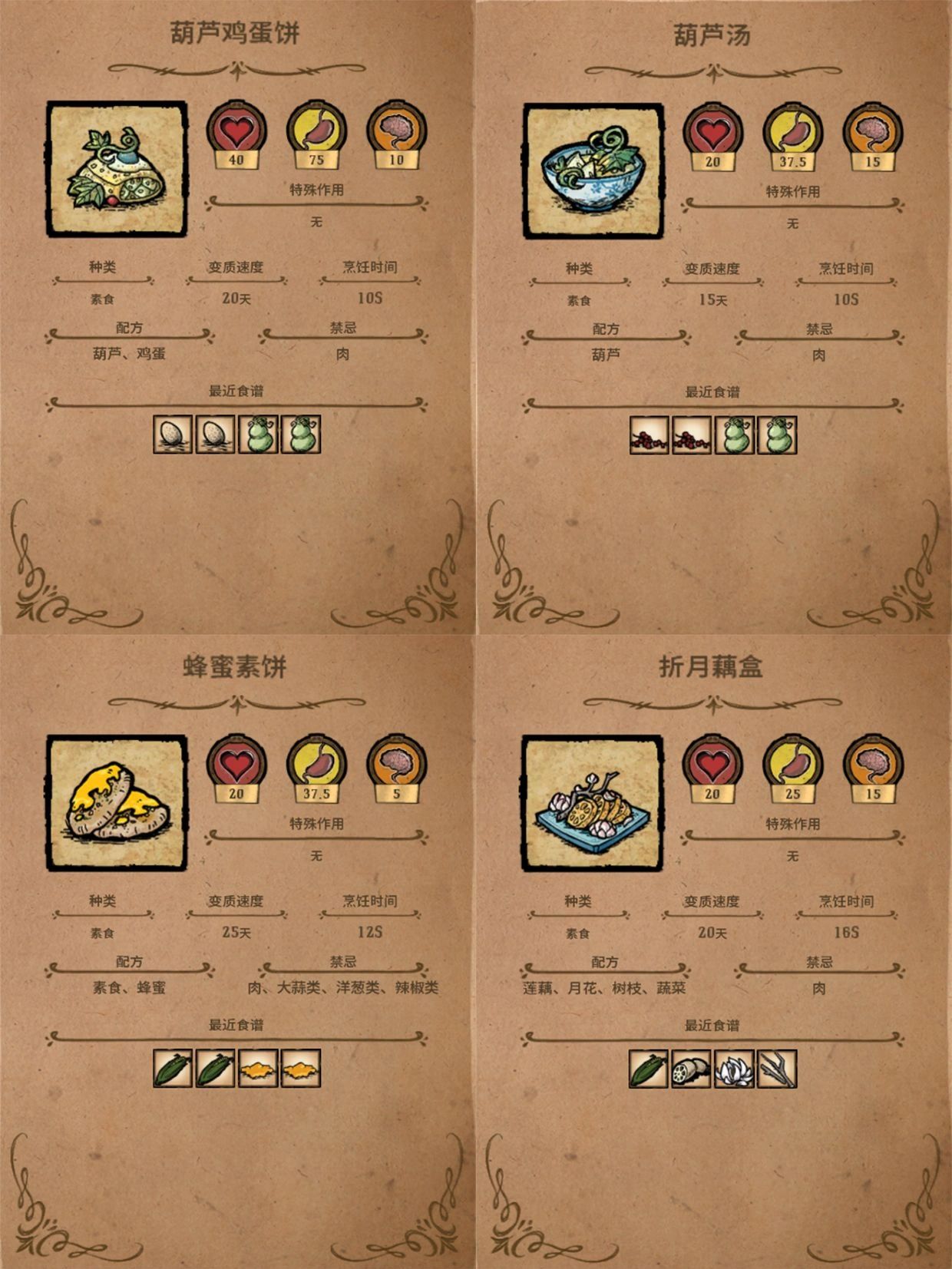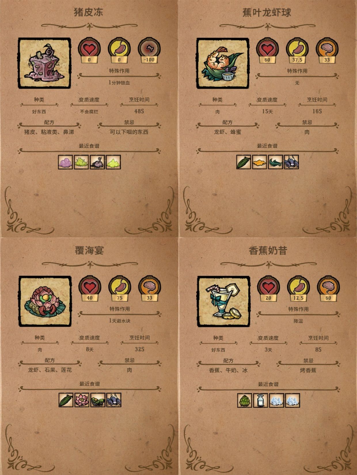 琥珀美食:1尘土块+3其他 给远古档案馆的月蛾吃的 牛奶帽:裸露鼻孔+奶制品+海带+其他 果冻沙拉:2叶肉+2甜度(蜂蜜、蜂王浆) 无花果酿树干:象鼻+无花果+其他 无花果烤串:1无花果+1肉+1树枝 禁忌:怪物度不超过1 无花果意面:1无花果+2菜 禁忌:肉 龙虾汤:龙虾+冰块+其他 蘑菇蛋糕:蓝蘑菇+绿蘑菇+红蘑菇+月亮蘑菇 禁忌:蘑菇必须是生的 藤壶握寿司:藤壶+海带+蛋+其他 海鲜牛排:鱼≥1.5,肉≥1.5 禁忌:冰块 藤壶中细面:2藤壶+2菜