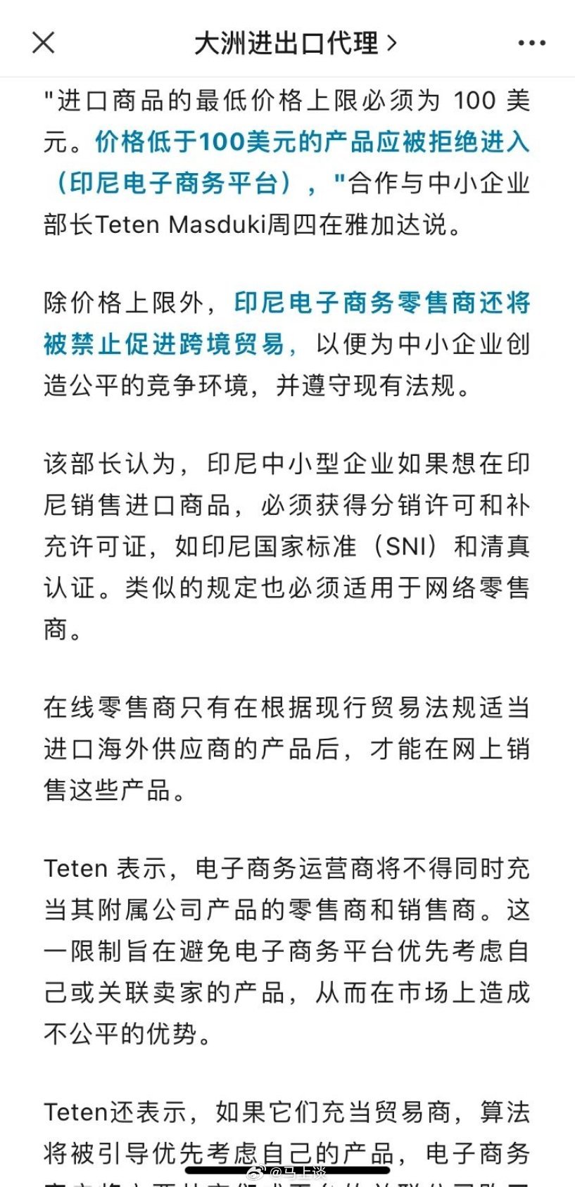 印尼将禁止在跨境电商平台进口100美元以下商品,用以保护中小企业免受电子商务零售商的不公平竞争。好奇,印尼会出口价值一百美元以下的商品吗?[吃瓜]