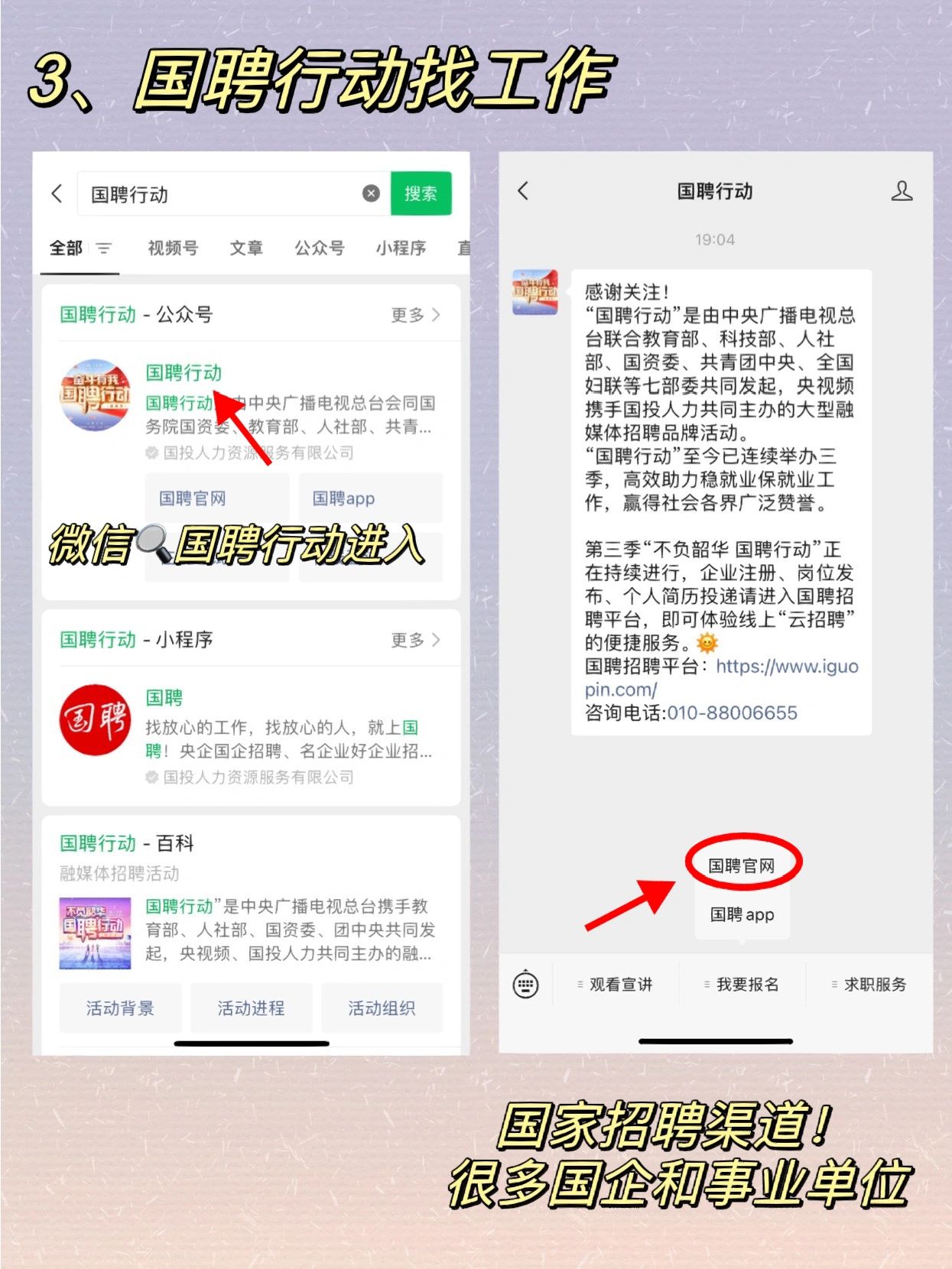 3.国聘行动:微信搜索国聘行动-国聘官网-选择地区筛选适合的工作,还可以参加“百场万岗”招聘会!