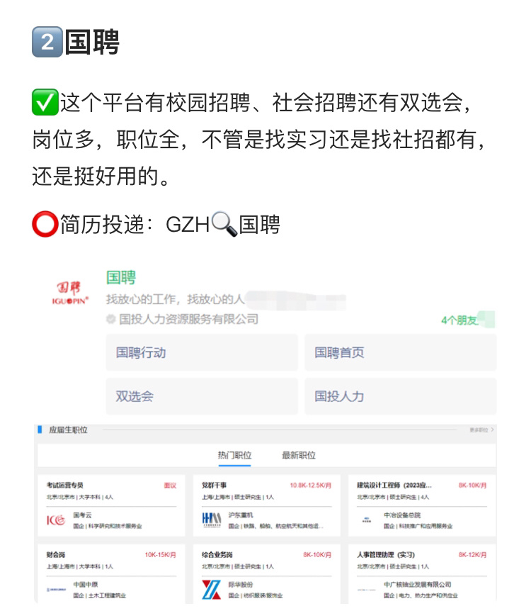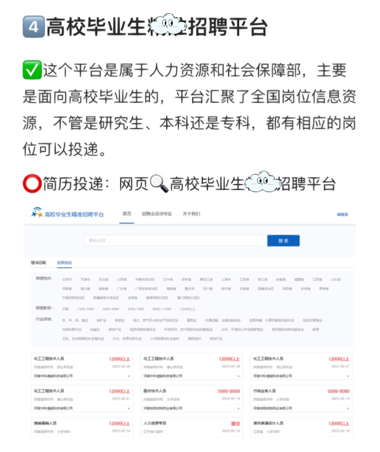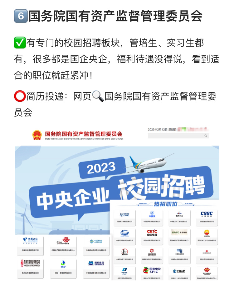 要学会多渠道投递,今天给大家整了6个国家出品的招聘平台,岗位多,专业又靠谱! 1️.国资小新 2️.国聘 3️.国资央企招聘平台 4️.高校毕业生招聘平台 5️.国家大学生就业服务平台 6️.国务院国有资产监督管理委员会 ·