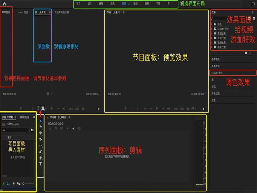 2:项目面板:导入所有素材选中素材长摁拖入序列面板序列面板: