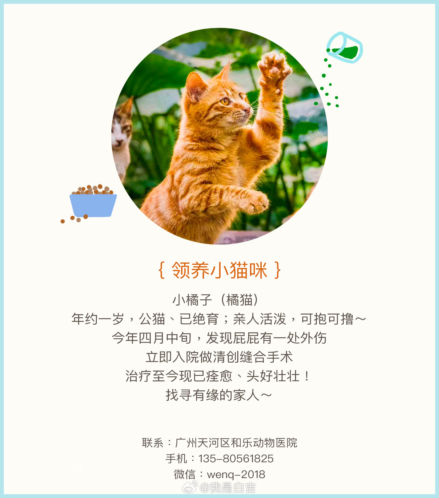 ●领养条件:生活工作稳定、广州同城领养、全窗封网、定期驱虫、科学喂养、接受回访(照片或视频)、有病就医。