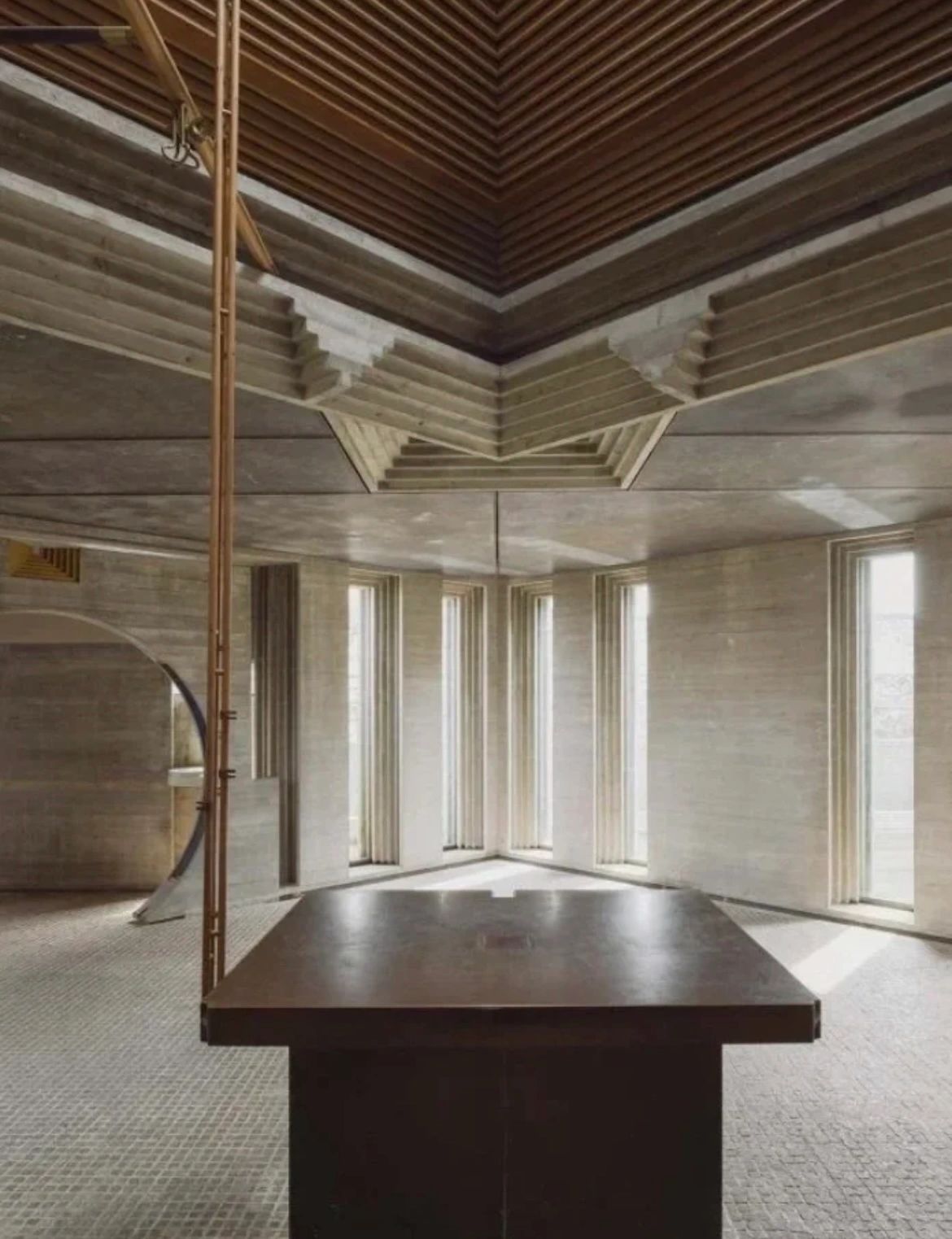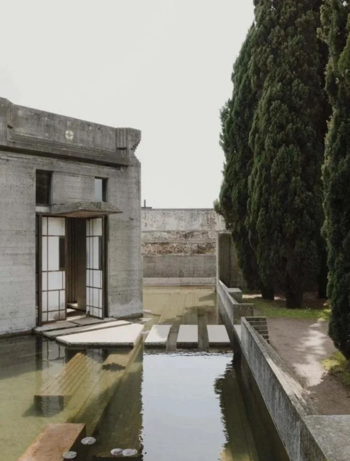 在这里,斯卡帕巧妙地将混凝土的严酷与大自然的柔软性进行对比,同时也增加了水的平静流动性。