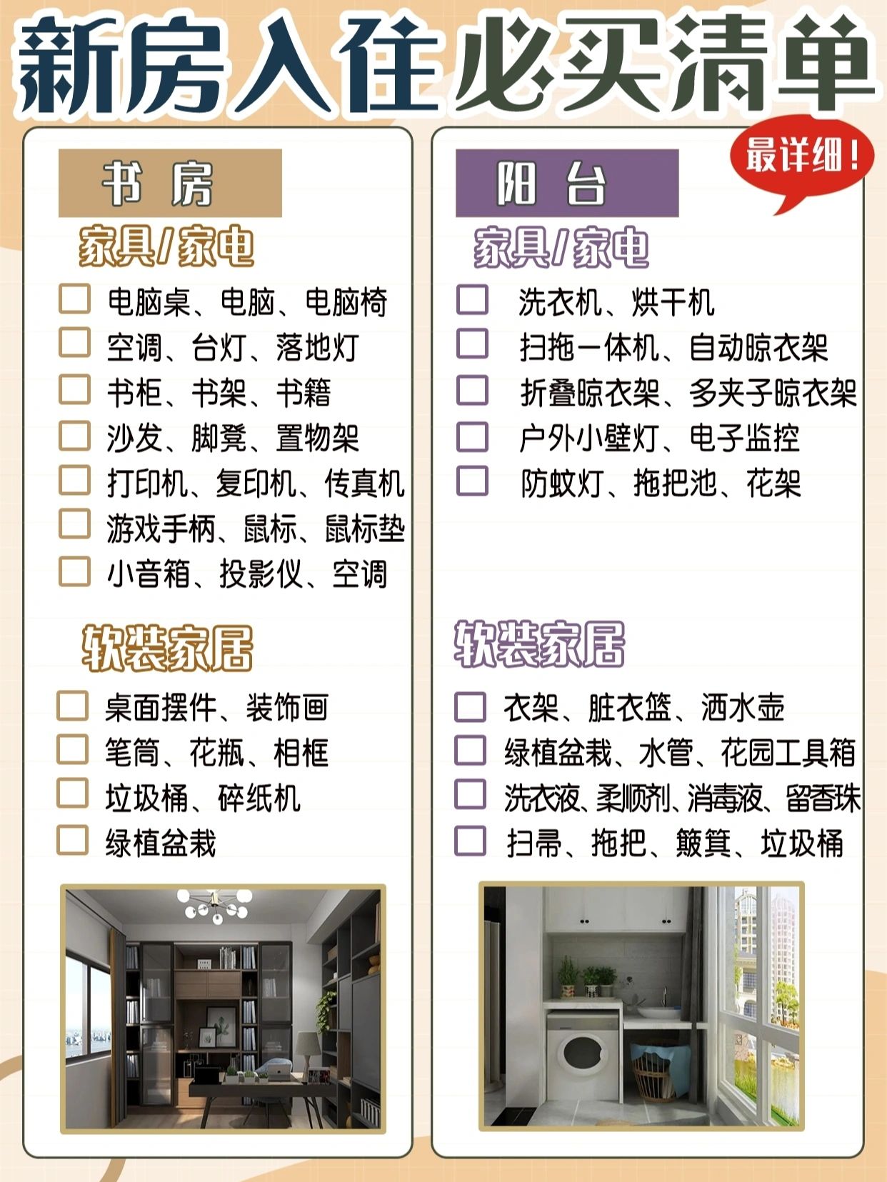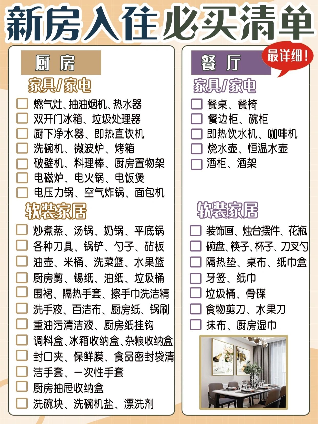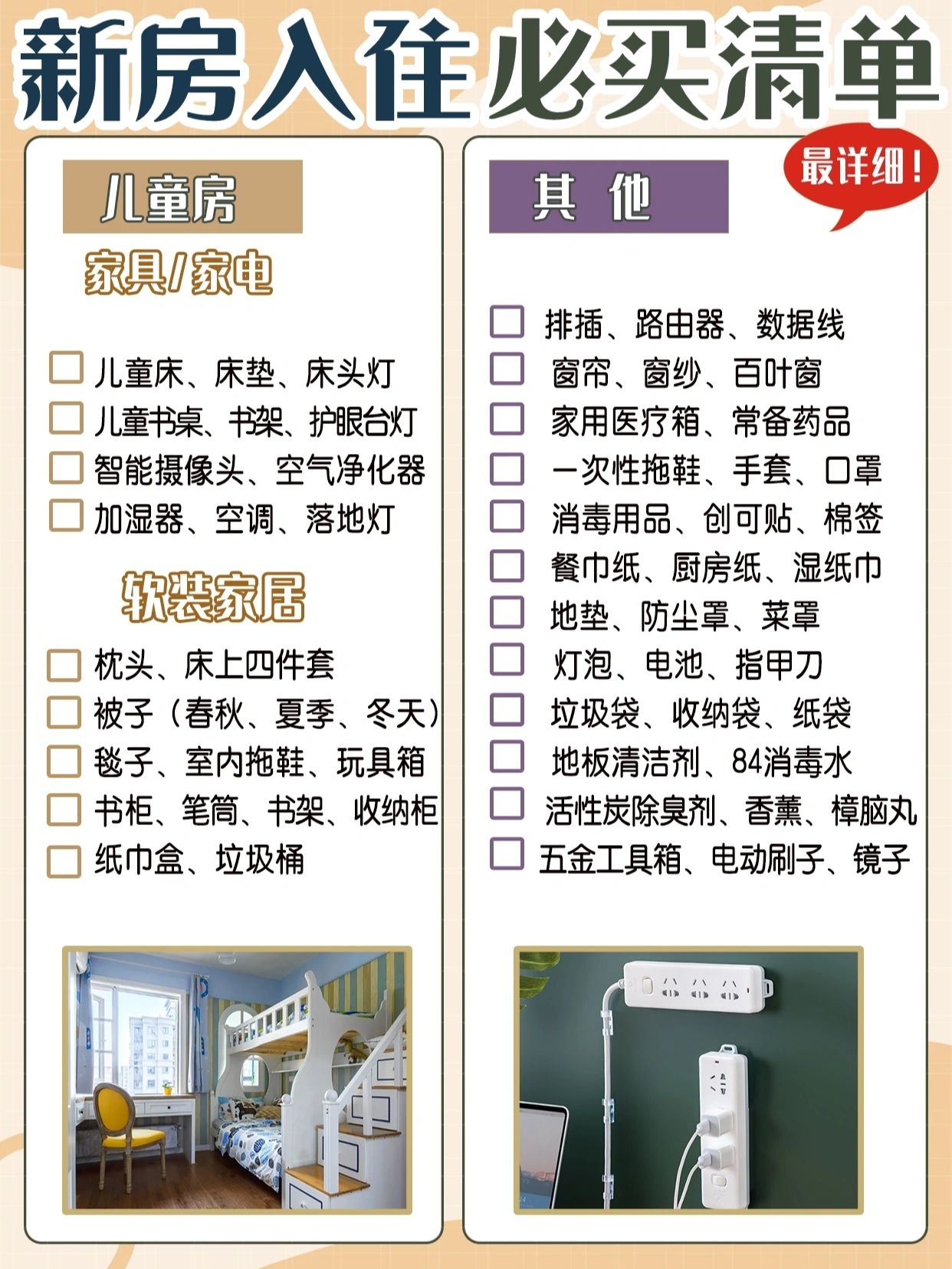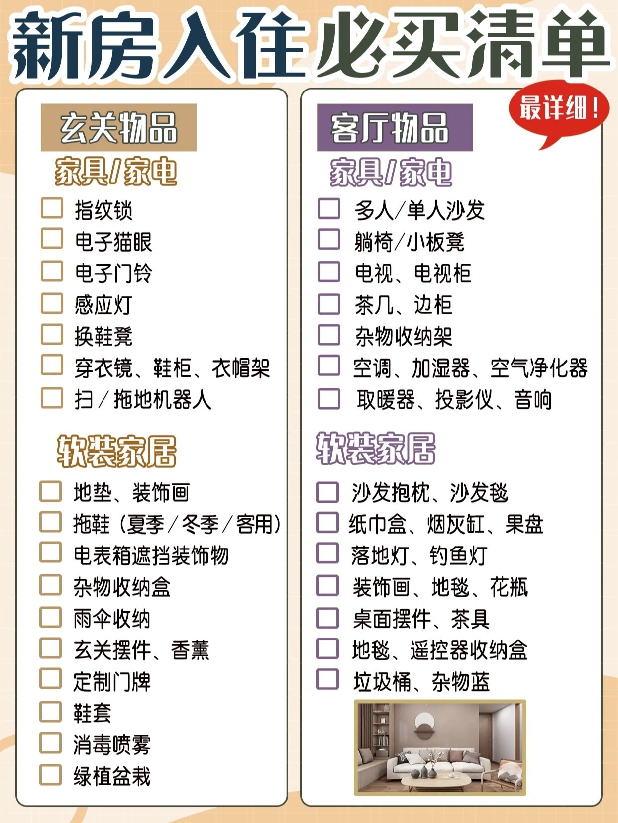 很多小伙伴都打算搬家,一半是高兴一半是迷茫,新房入住不知道买什么,怕买少,怕买错,怕买忘 不要慌,今天就给小伙伴们整理好了,新房入住需要买的物品清单,欢迎大家抄作业~ . 新房入住 必买物品清单 全屋物品概览-图1 玄关/物品 客厅/物品-图2 厨房/物品 餐厅/物品-图3 卧室/物品 浴室/物品-图4 书房/物品 阳台/物品-图5 儿童房/物品 其他/物品-图6 . 家是温暖的港湾,愿在奔波劳累的盆友都能在自己的港湾里歇歇脚,希望分享的物品清单,能帮你查缺补漏,省省心~