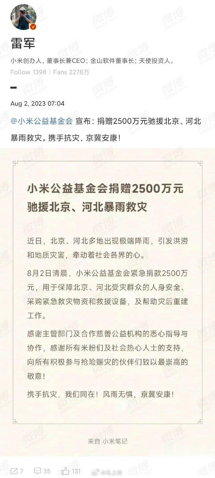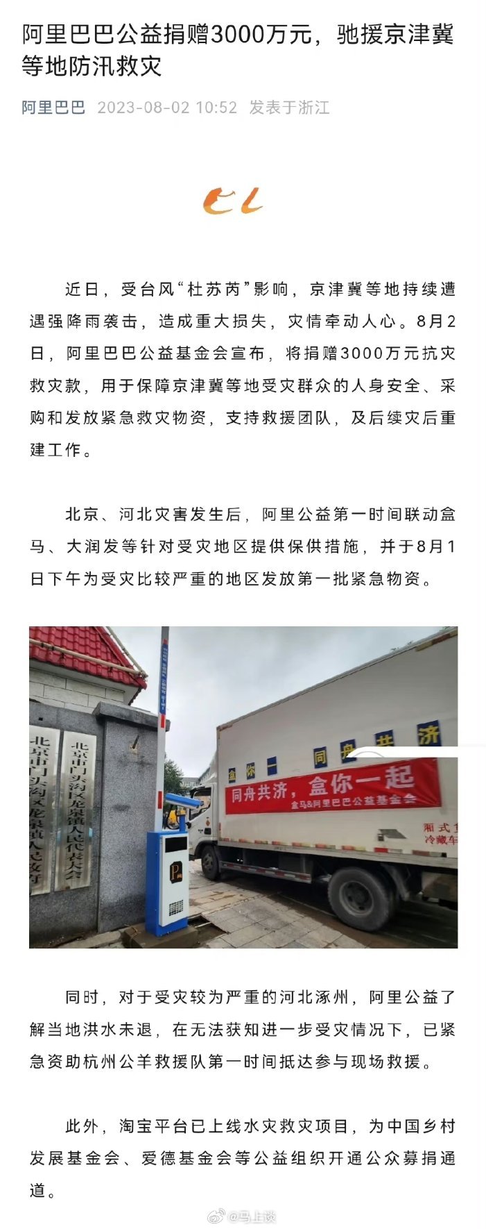 #字节捐赠1亿元驰援防汛救灾##小米捐赠2500万驰援北京河北暴雨救灾##阿里巴巴捐赠3000万驰援京津冀防汛救灾#