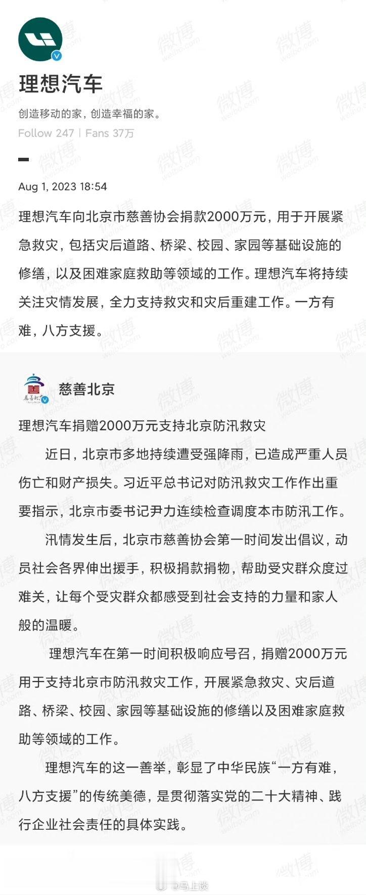 #多家企业驰援北京河北救灾#多家企业驰援北京河北救灾,字条跳动向受灾地区捐了一个亿,阿里巴巴捐赠3000万,小米捐赠2500万,理想汽车捐了2000万…一方有难,八方支援!为这些企业点赞![赞][赞][赞][赞][赞][赞]
