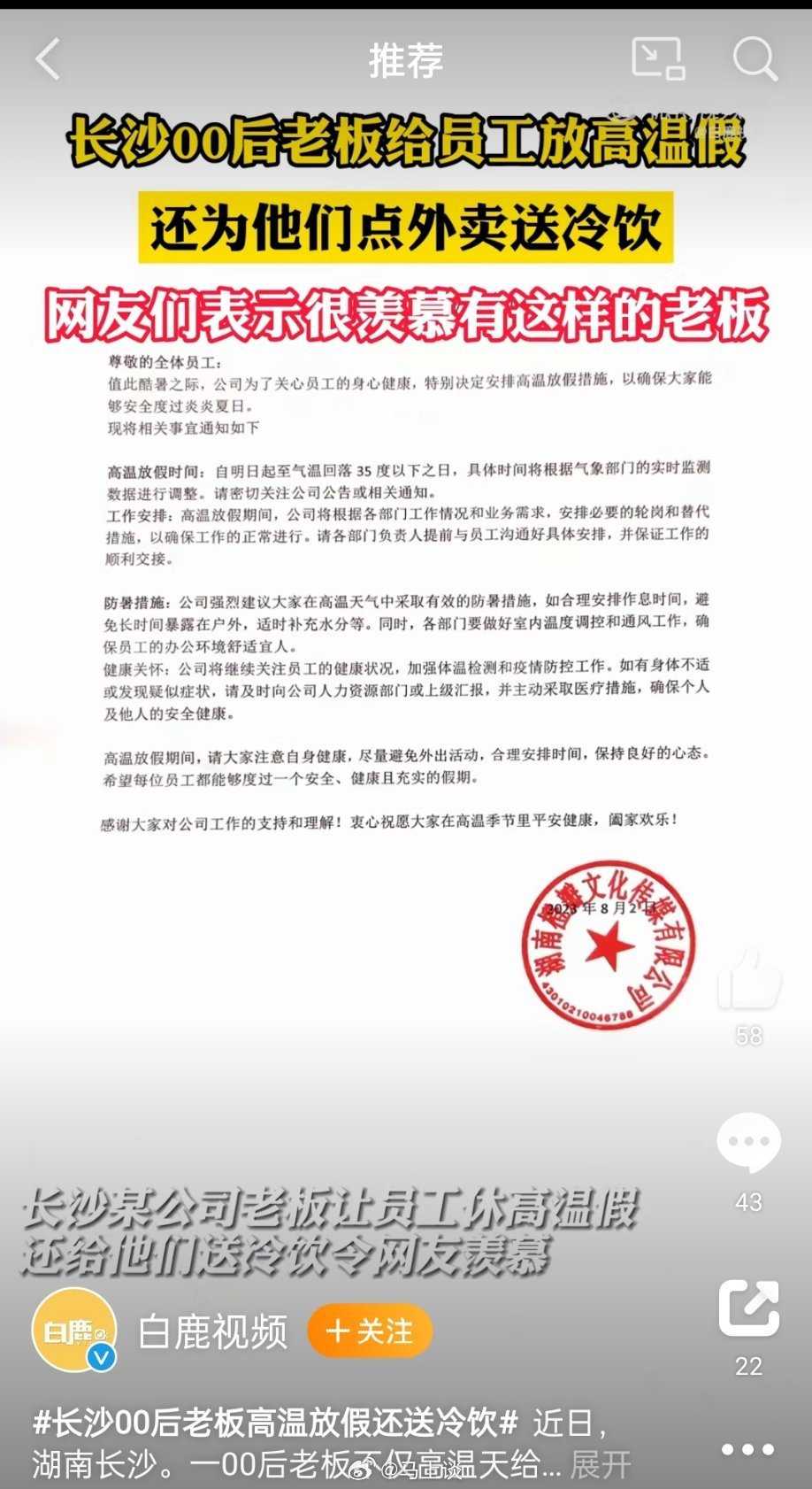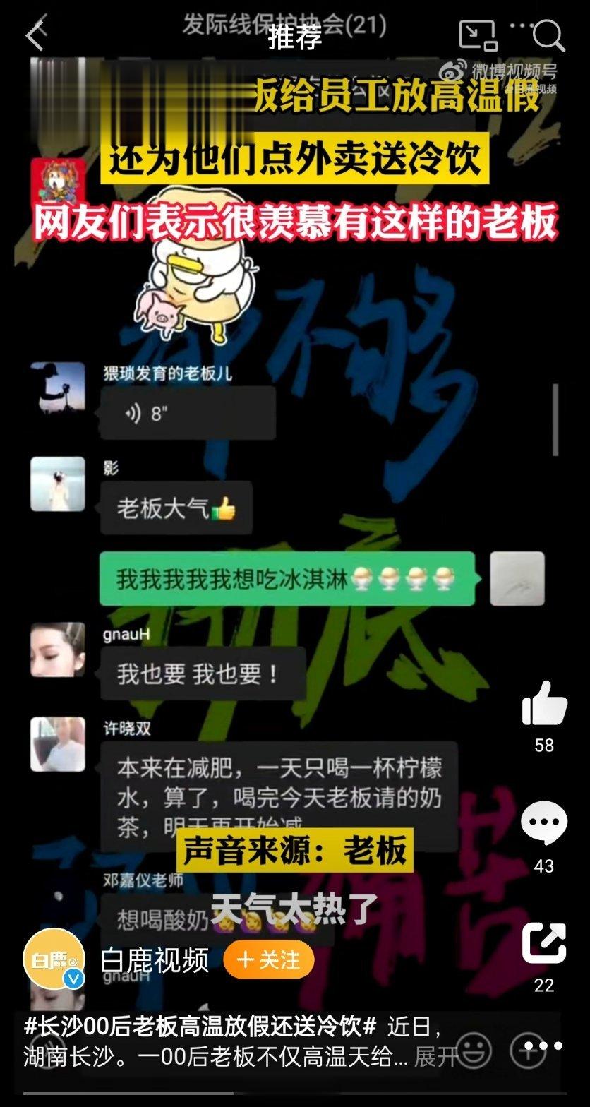 #长沙00后老板高温放假还送冷饮# 什么样的老板,高温天给员工放假,还给居家值班的员工点外卖送冷饮?00后老板!公司氛围好,工作群叫“发际线保护协会”,零食奶茶还管够,这样的班我劝你们别上,让我来![泪]