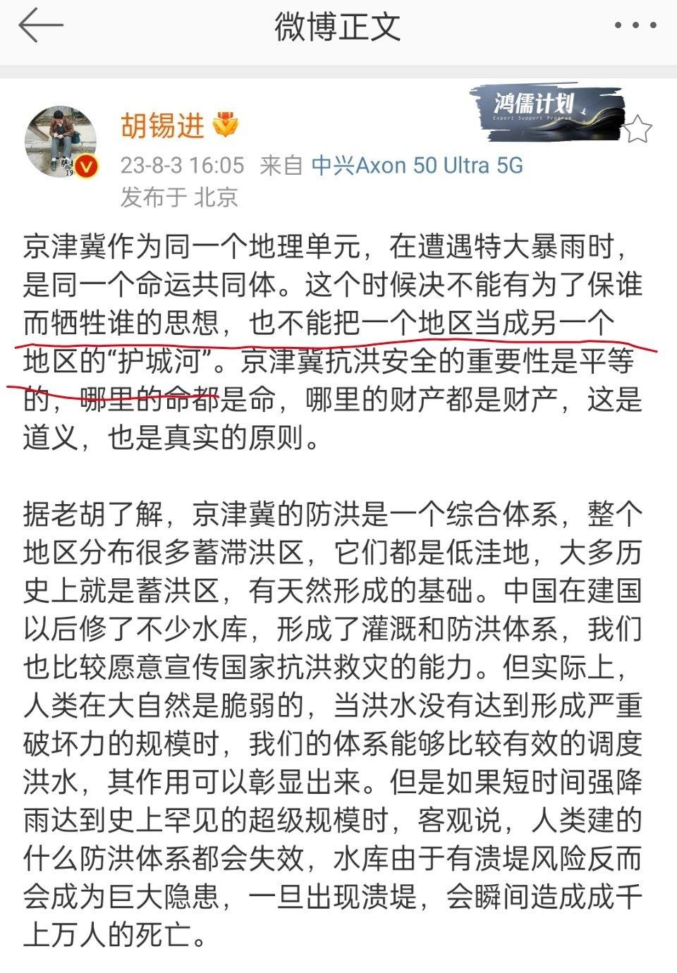 爱我中国 19 2023-08-04 11:25 谁也不愿意见到这种情况,那总得有牺牲,人家书记话糙理不糙,就是说话场合不适宜,老胡也来扮圣母,除了蹭热度,也没啥用处,教训就是做了也要谨言,别给别人抓辫子 爱我中国 回复 08-05 08:25 你别造谣拉仇恨,哪个新闻里播了造成人员未及时撤离?别把之前的被困人员混为一谈,启动蓄洪放水前这些事情必做,哪个敢担死亡大量人员的责任,你是说中央和各部委还没有你事后的决策英明,不放闸淹了北京城你们还不是一样装圣母乱叫唤 时代浪潮 回复 08-05 09:02 这本身就是落后的表现,不会你以为这是应该的吧?
