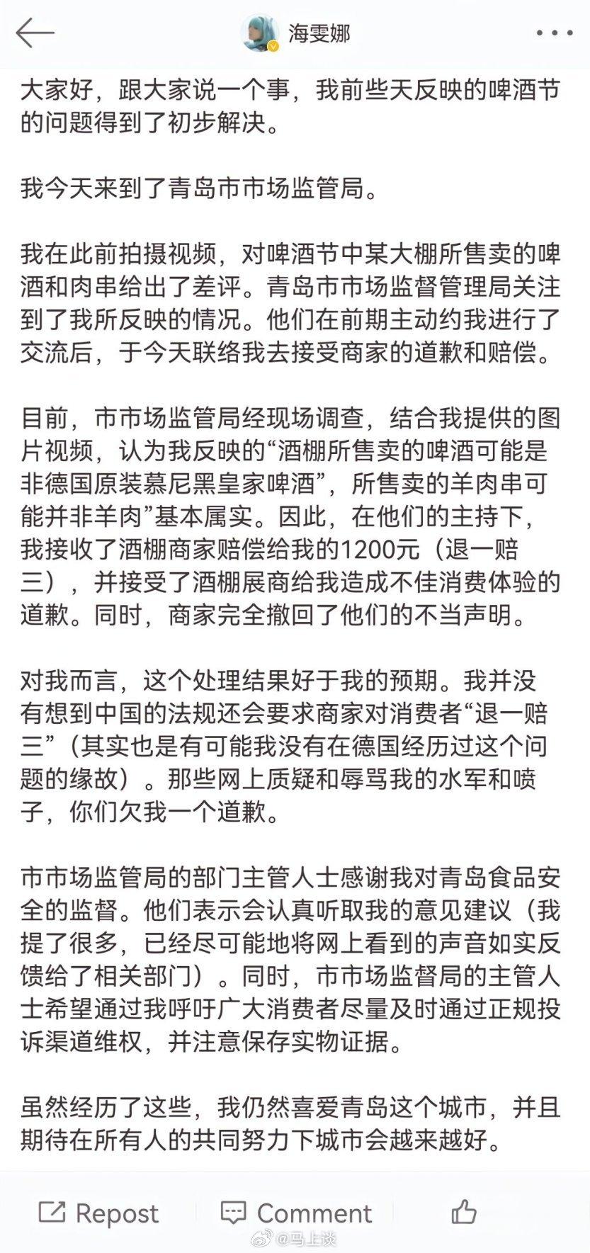德国女子海雯娜说“青岛啤酒节商家出售的啤酒非德国产,羊肉并非羊肉”的最终结果: