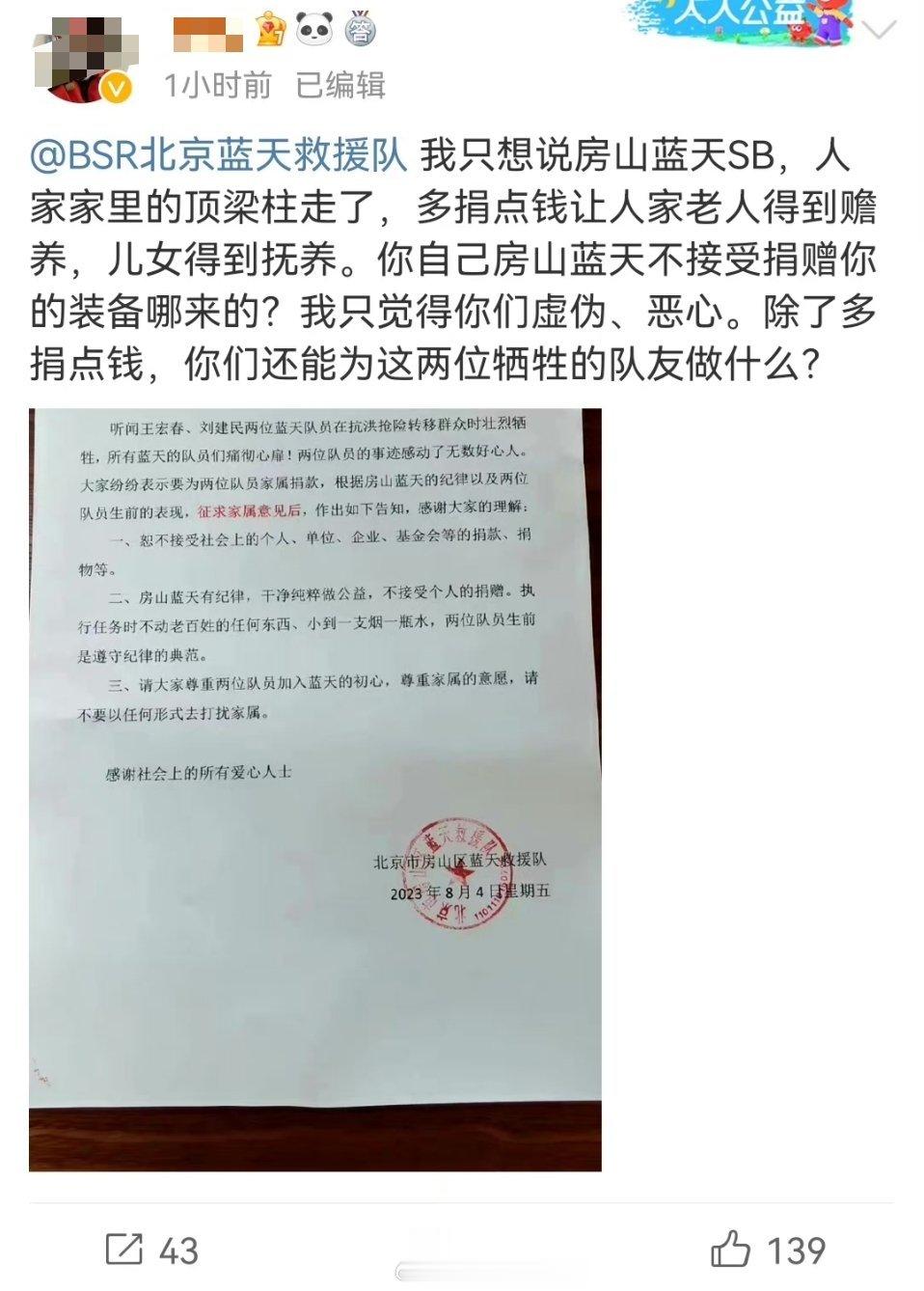 #牺牲蓝天队员家属拒绝接受捐款##房山蓝天救援队发布捐款告知#