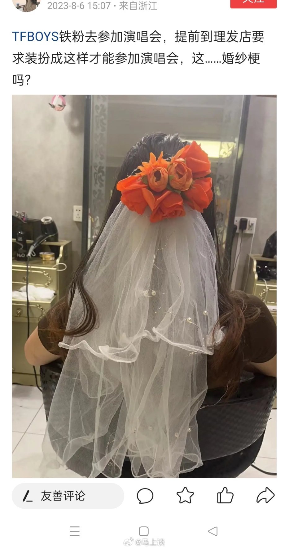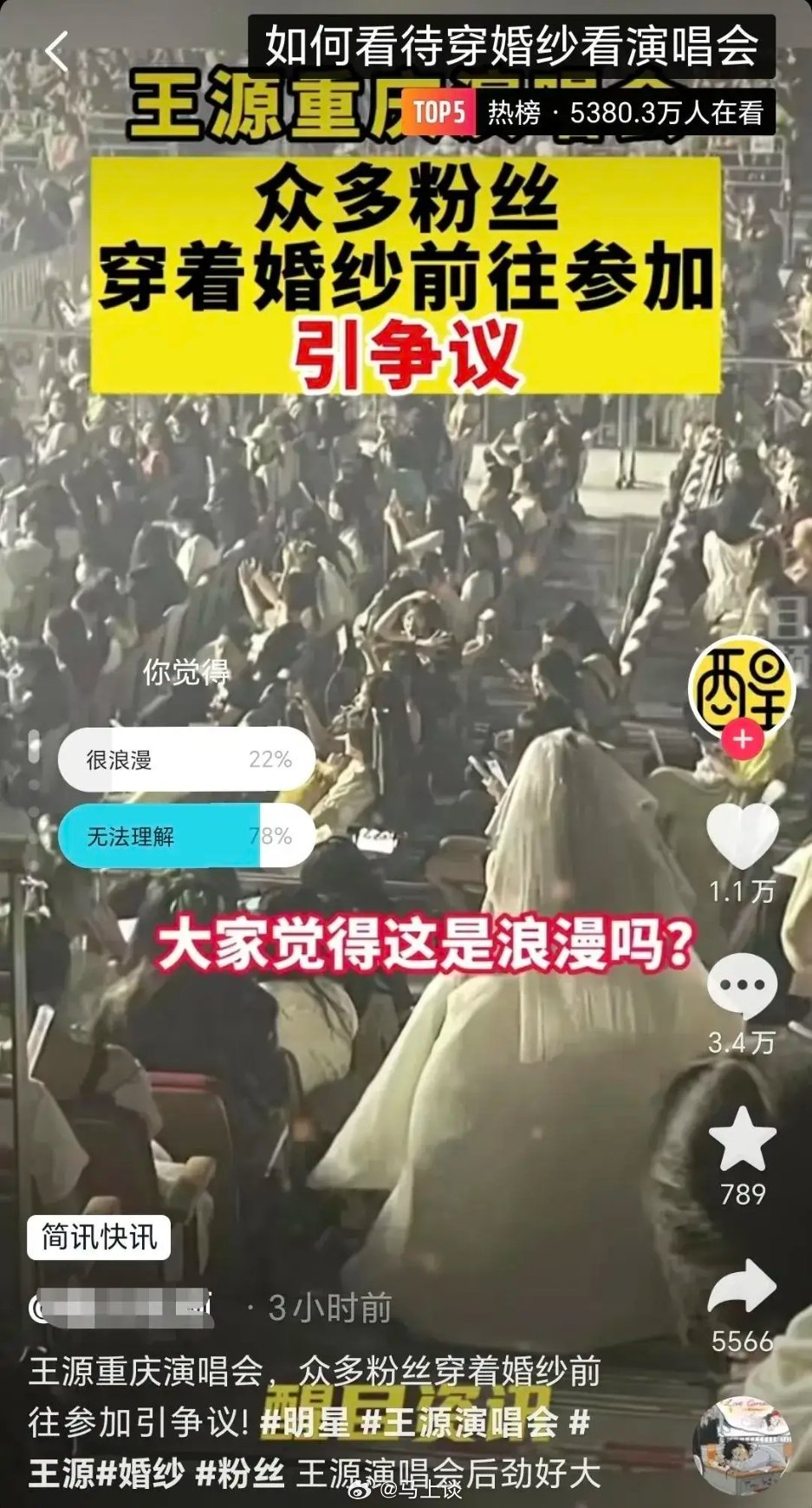 女粉丝身批婚纱参加TFBOYS十年之约演唱会…上次王源演唱会,有很多人穿婚纱去看并大喊“王源娶我”,一位粉丝回家后男友分手引起热议。女粉丝还坚称自己的行为只是在纪念青春,而不是精神出轨。但网友表示,婚纱是神圣的,不能在除婚礼以外的场合随便穿。