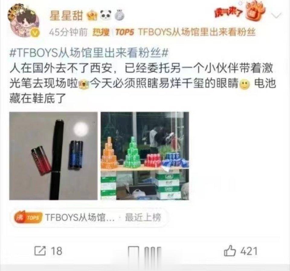 粉丝说拿激光笔照易烊千玺的眼睛,就真的照他眼睛…这可能是TFBOYS不合开演唱会的原因,还没开三方粉丝就打架,开了粉丝互照对方爱豆眼睛,纯纯的互害……[笑cry][笑cry][笑cry]