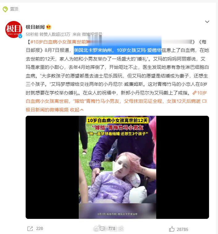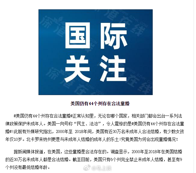#10岁白血病小女孩离世前嫁给男友# 整体来说,的确和童婚扯不上,但小姑娘所在的州很恶心。美国尚有13个州允许16岁以下未成年人结婚,其中小女孩所处的北卡罗来纳州,更是臭名昭著的“童婚目的地”,是美国成年人与未成年人结婚的的乐土!此前有外国研究所指出,2000年至 2018年间,美国有近30万名未成年人合法结婚,有女孩年仅10岁。