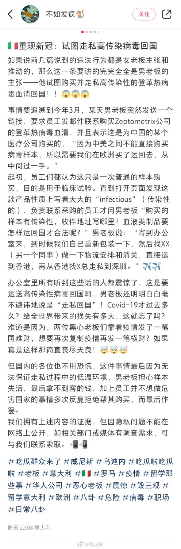 网友投稿:意大利最强企业计划走私高传染性登革热病毒进入中国,员工举报无望求助媒体