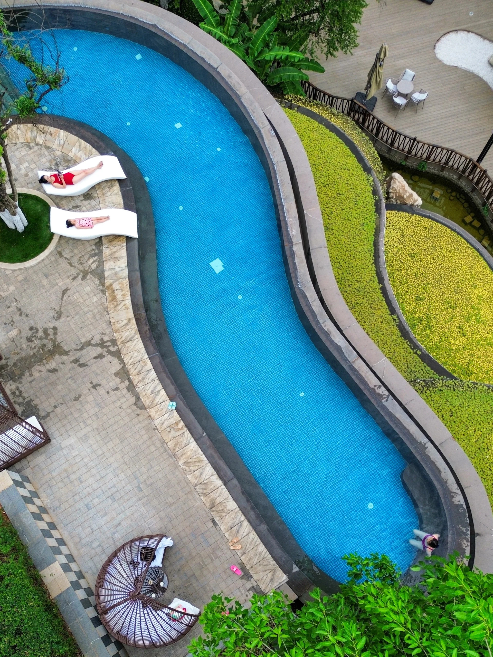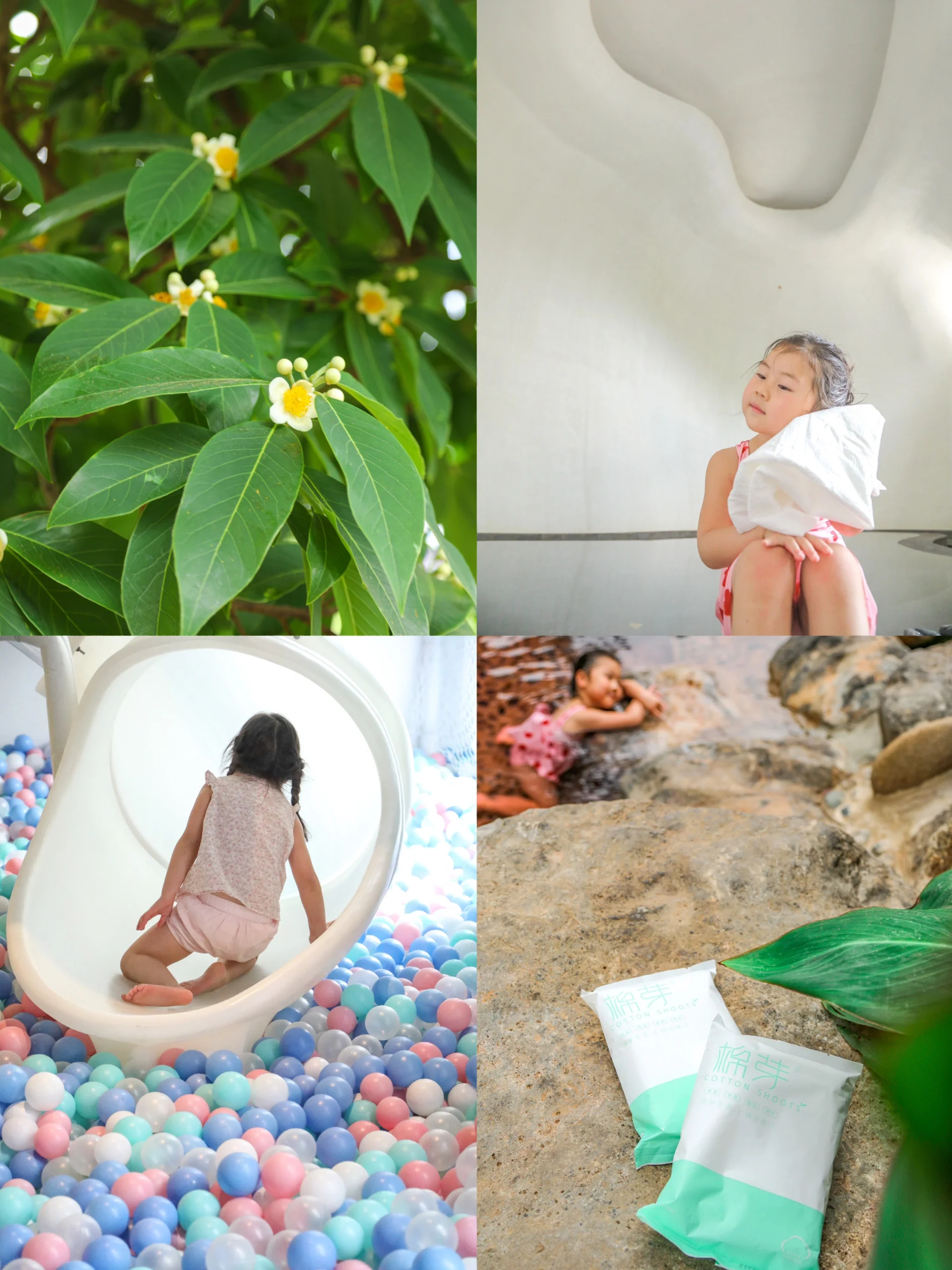 温泉出水45℃,室内外共31个泡池,水疗馆、盐屋、趣味水滑道、高空景观泡池……与自然景观融为一体。