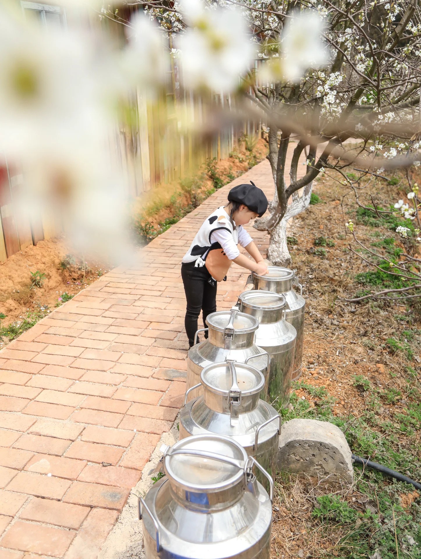 园内有果园、菜地、奶牛、圈养小动物。这季梨花正开。