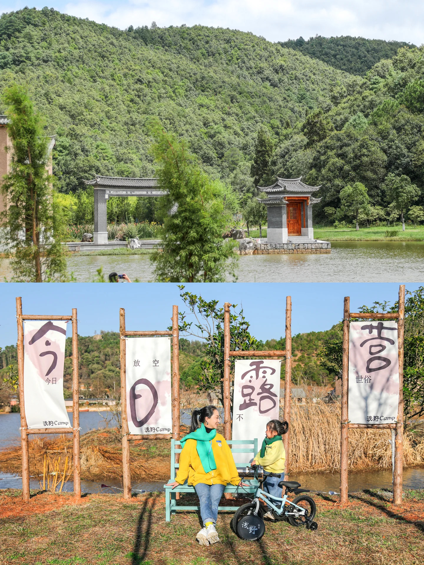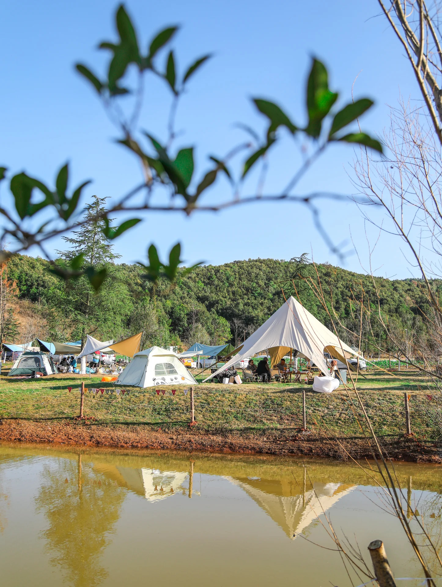新晋营地与农家乐的烧烤A区隔水相望,水中天鹅游弋,身后群山环抱。