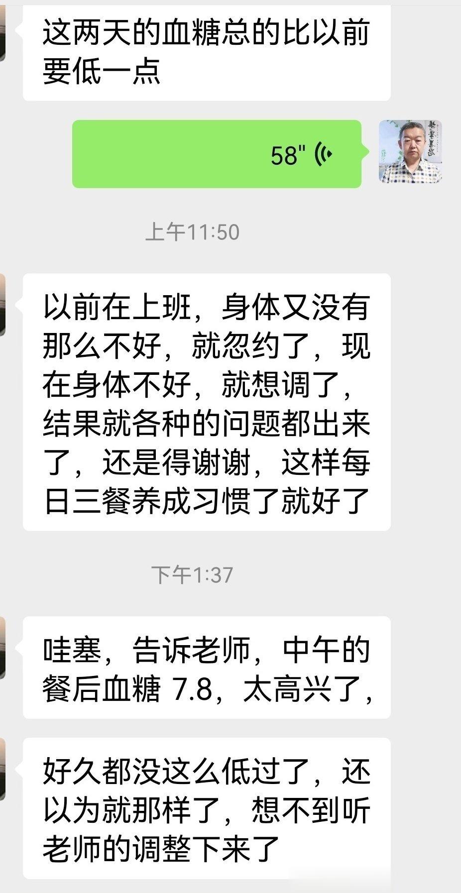 一个老同事,和我年龄差不多。也是去年吧,刚刚确诊糖尿病,餐后10,空腹7点几,找我,不想用药。我给她分析指导好像7-10天三餐,餐后8,空腹6.5以内,好了能6以内。这个值一直维持到现在。