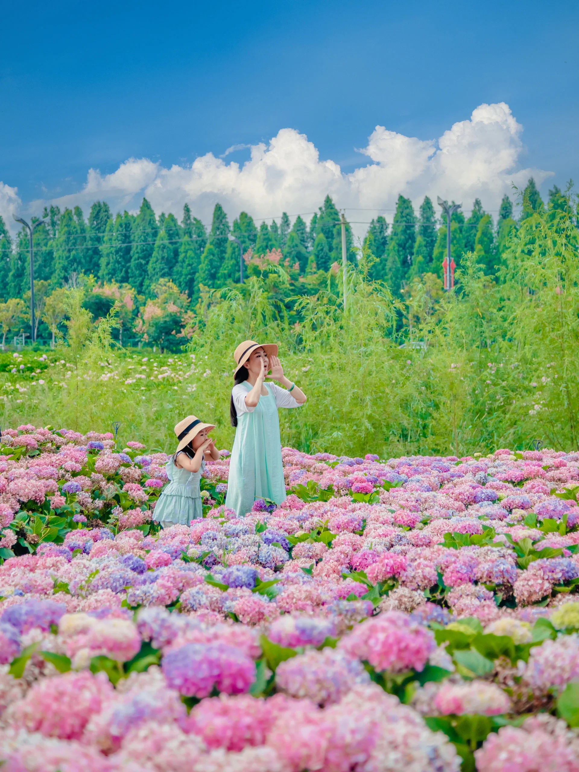 斗南湿地公园与王官湿地公园接壤处盛放着绣球花,恬静的蓝色、淡雅的白色、清新的紫色,拥拥挤挤铺满园区。