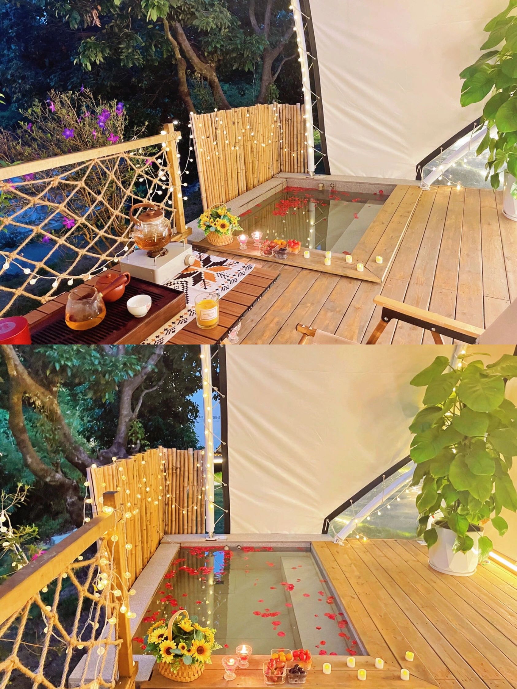 1、免费提供:早餐、下午茶、卡式炉、烧烤炉、煎锅、火锅、露营灯、营地车、天幕桌椅、秋千吊床、温泉池(小帐篷无温泉)