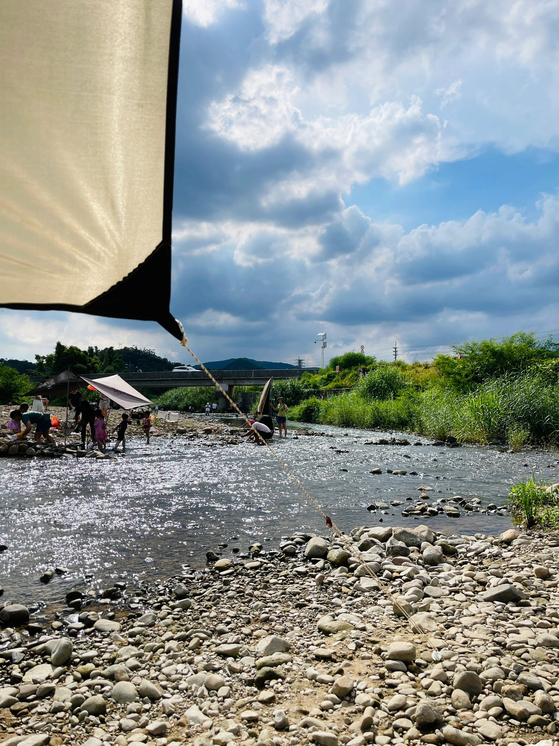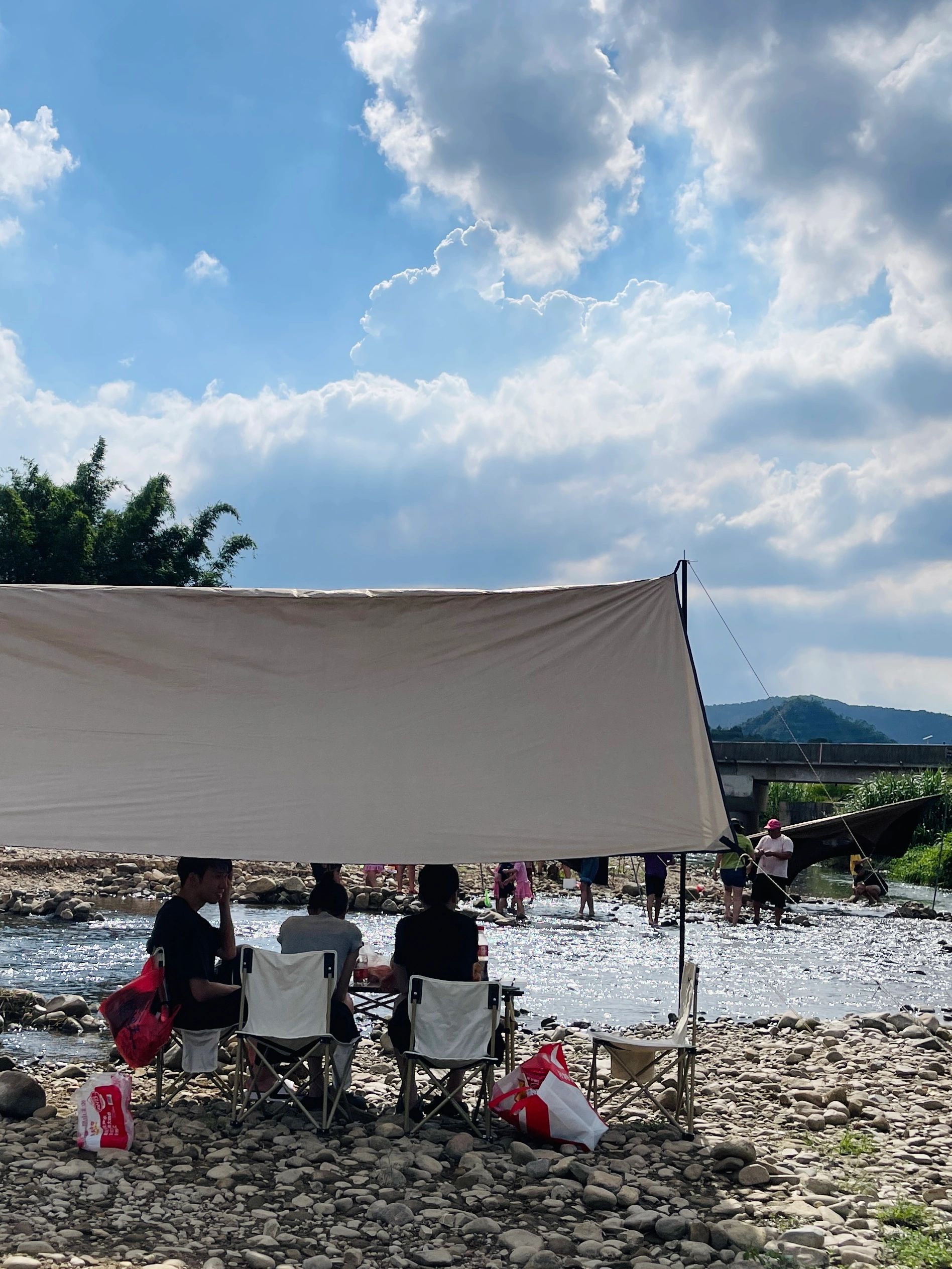 地址是中田桥,在广州从化,广州市区开车1小时直达,停车方便且免费。 溪水非常清澈,水里有很多小鱼,带上抓鱼工具尽情的玩耍吧~ 玩水面积大,河滩也大,比较平缓,很适合搭天幕,我们就是把天幕搭到小溪里。 水很清,去的时候都是小孩子在玩。
