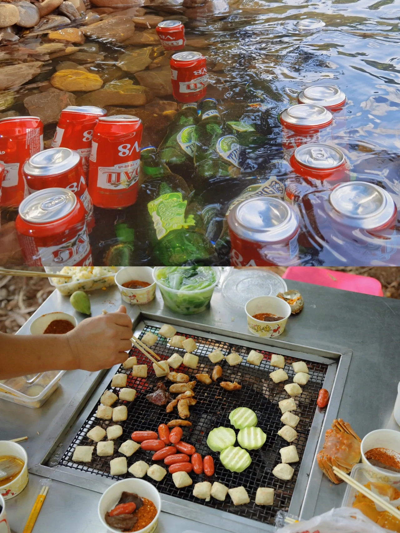 📍商家1:上段我写“停车位2”停车位置停好后,就可见挨着江边很多烧烤桌,租桌+ 烧烤炭火(免费续火)100。