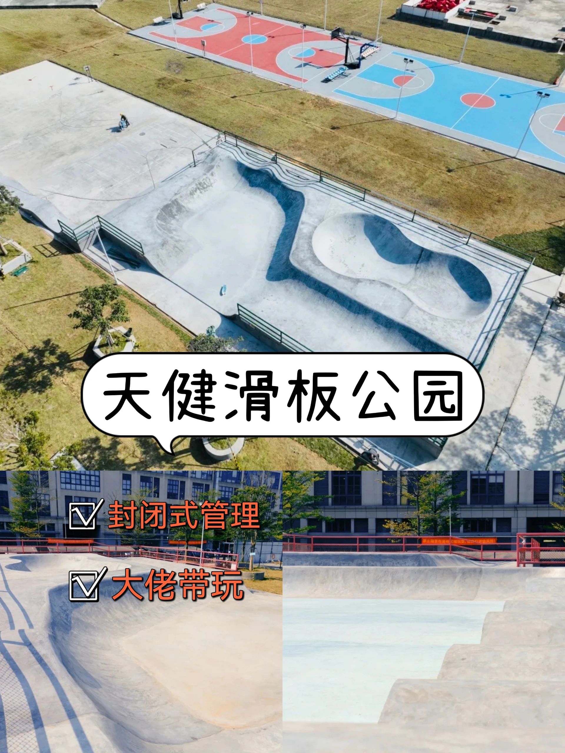 ✅有一大一小开放式碗池和空旷平地,人很少,碗池深度较浅,坡度较缓,对于进阶的板仔刚刚好。