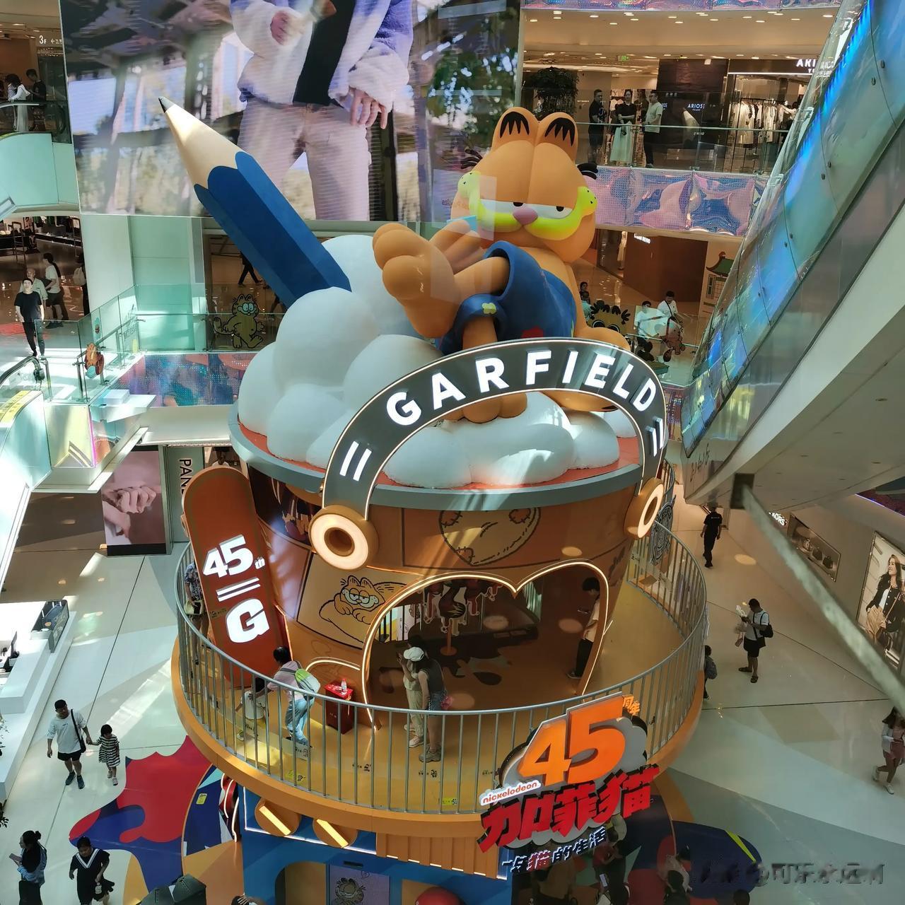 北京王府井apm商场一层免费看展,加菲猫45周年,一只猫的生活,室内展览时间为2023.7.28-2023.8.20,室外展览时间为2023.7.28-2023.9.3。 加菲猫是从小最喜欢的漫画之一,这次展览主要分为三部分,apm商场室内一层展览,室外正门和侧门展览。 室内一层展览最佳打卡地是三层,可以看到顶部的慵懒加菲猫。有彩绘加菲猫和各种可爱加菲猫。 室外正门展览为加菲猫加欧迪。 室外侧门展览为加菲猫大头盔。 没看到加菲猫主人乔恩。 作为加菲猫粉丝非常喜欢这个展览。