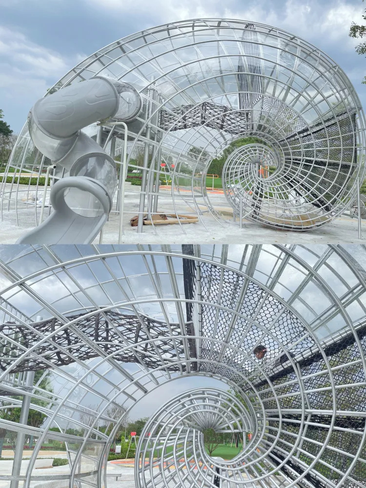 公园最吸引小孩的就是大大的蜗牛滑梯和大云朵跳垫秋千、沙池、篮球架、玩水设施等等