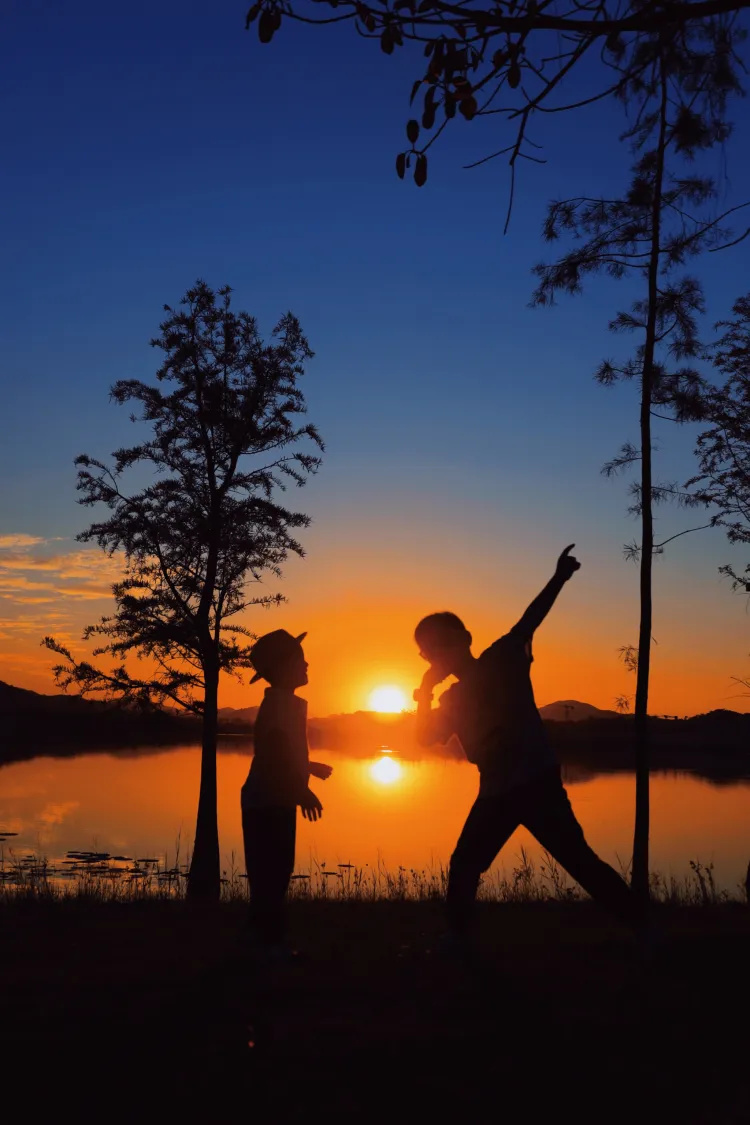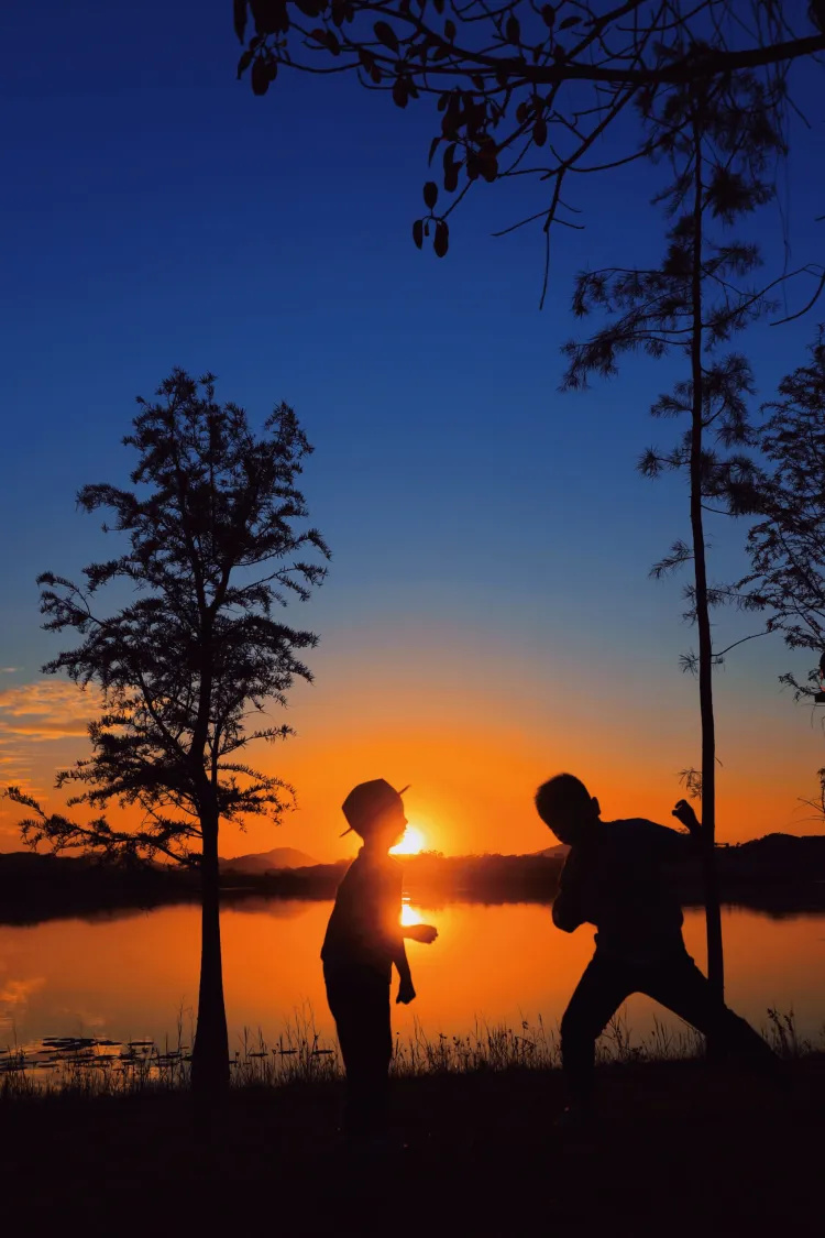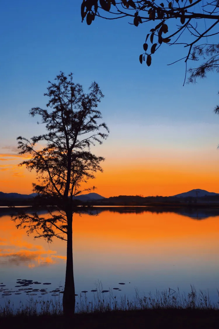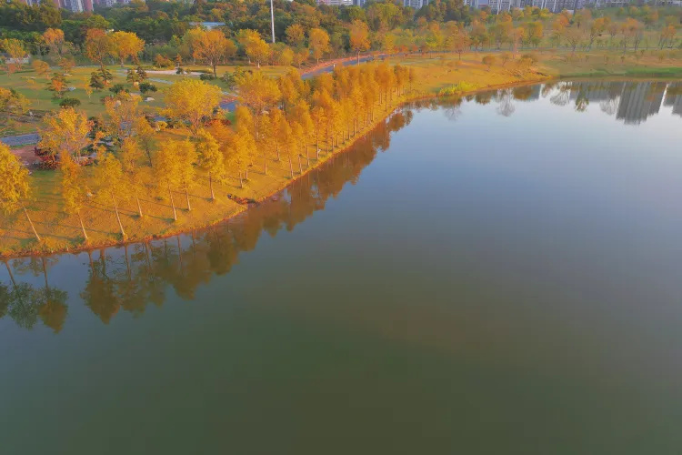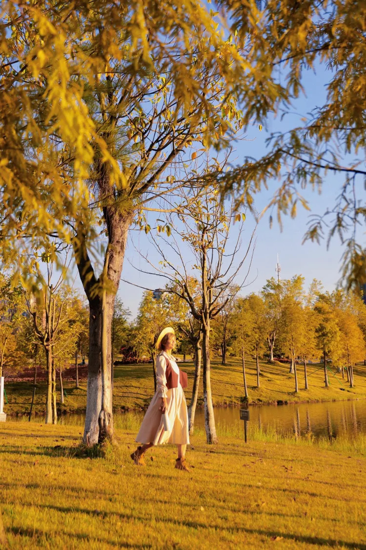湖边的杉林渐黄,特别接近黄昏时分,被落日余晖染成了金色~
